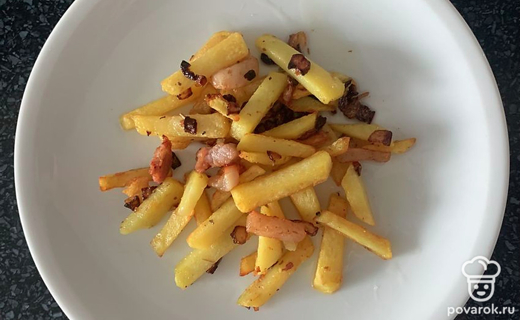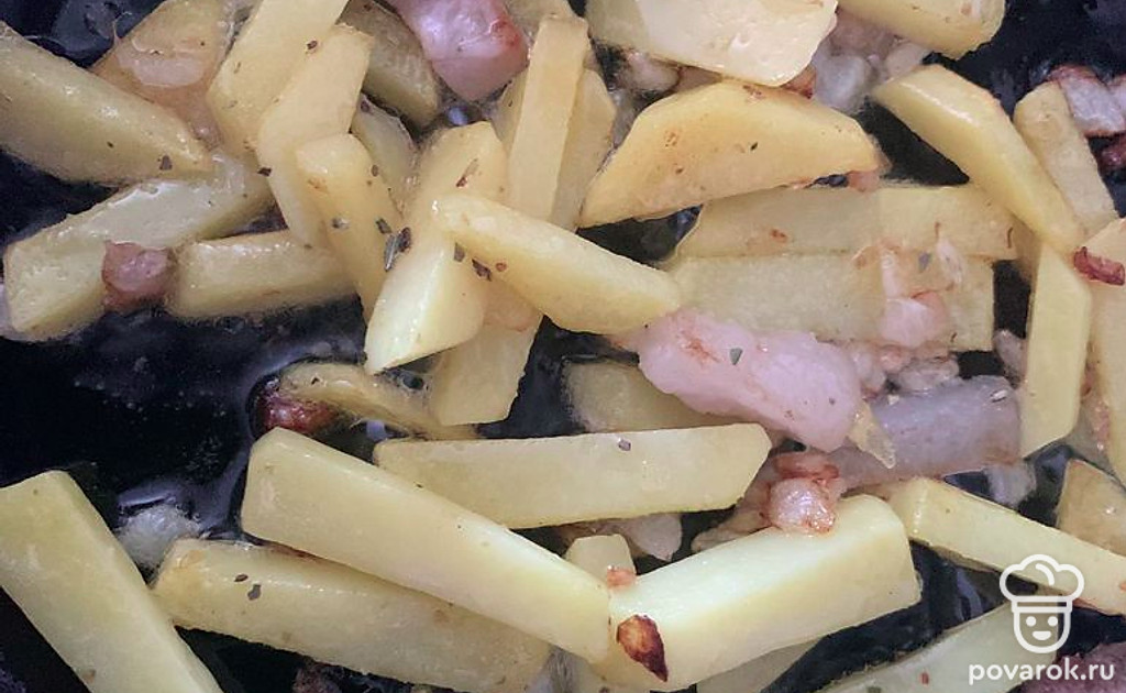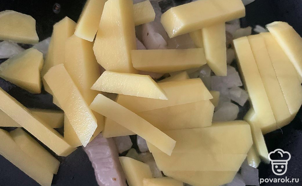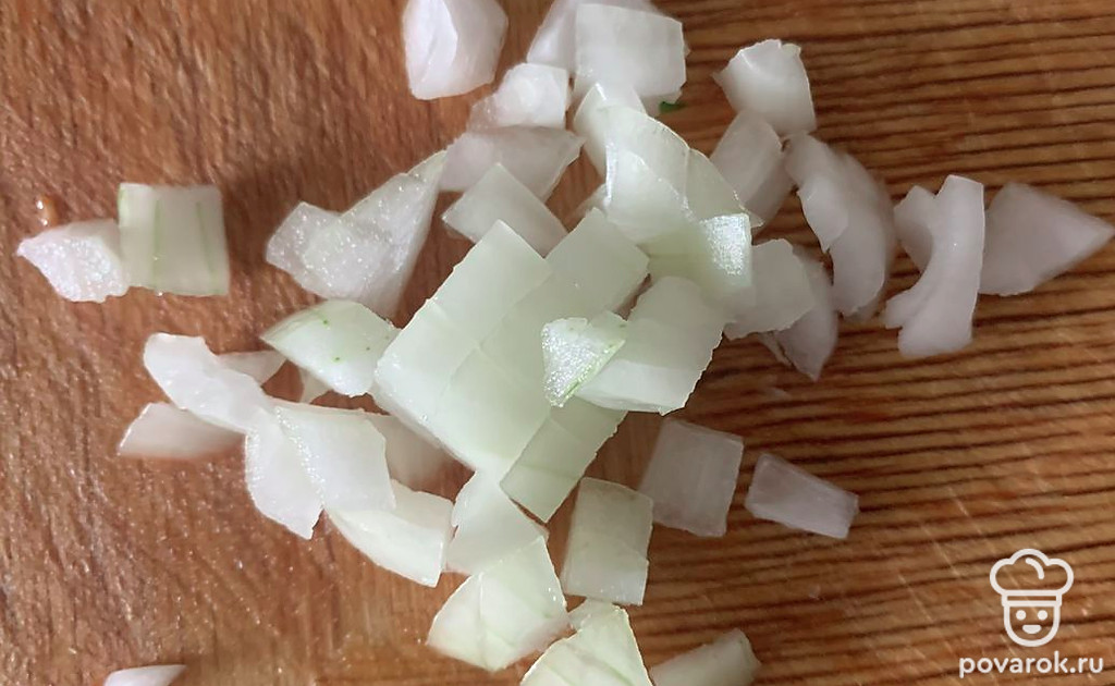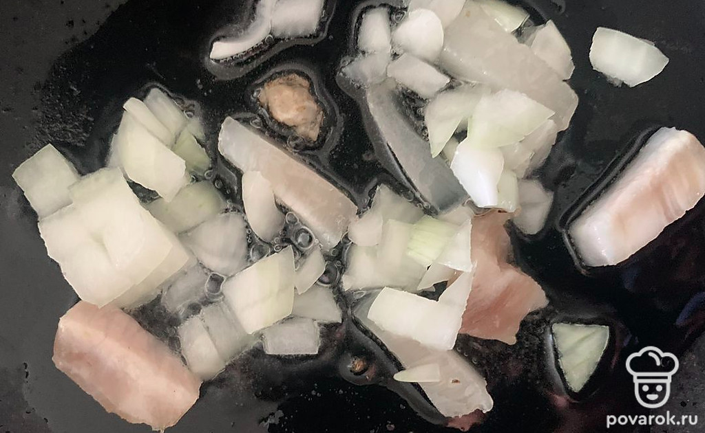 Добавить лук на сковородку, обжаривать 3 минуты.