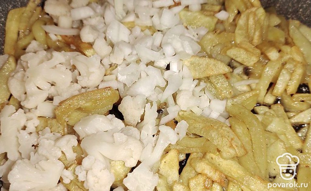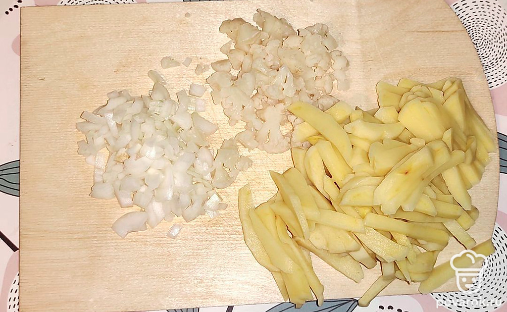Отварите цветную капусту заранее, почистите картофель и репчатый лук. Картофель нарежьте соломкой, как можно тоньше. Лук и капусту мелко порубите.