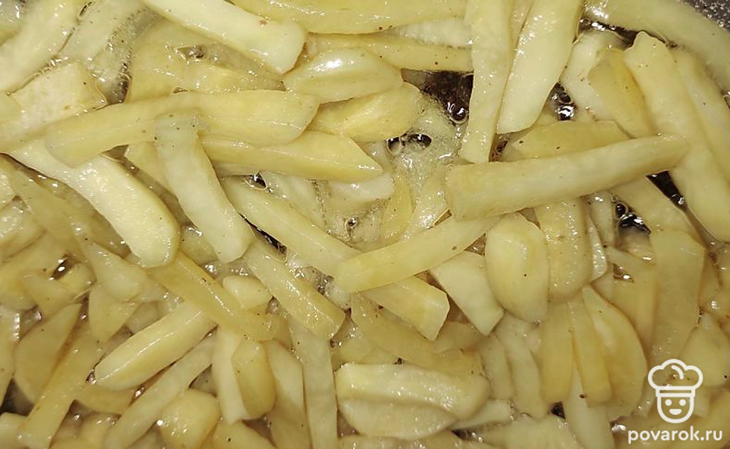 В сковороду налейте масло, поставьте разогревать на сильный огонь. В кипящее масло добавьте картофель. Жарьте на сильном огне в течение 7минут, периодически помешивая.