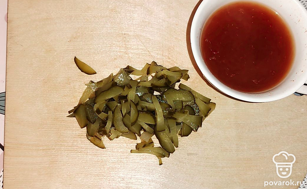 Пока основные ингредиенты томятся в сковороде, нарежьте маринованный огурец тонкой соломкой. Смешайте аджику с кипяченой водой.