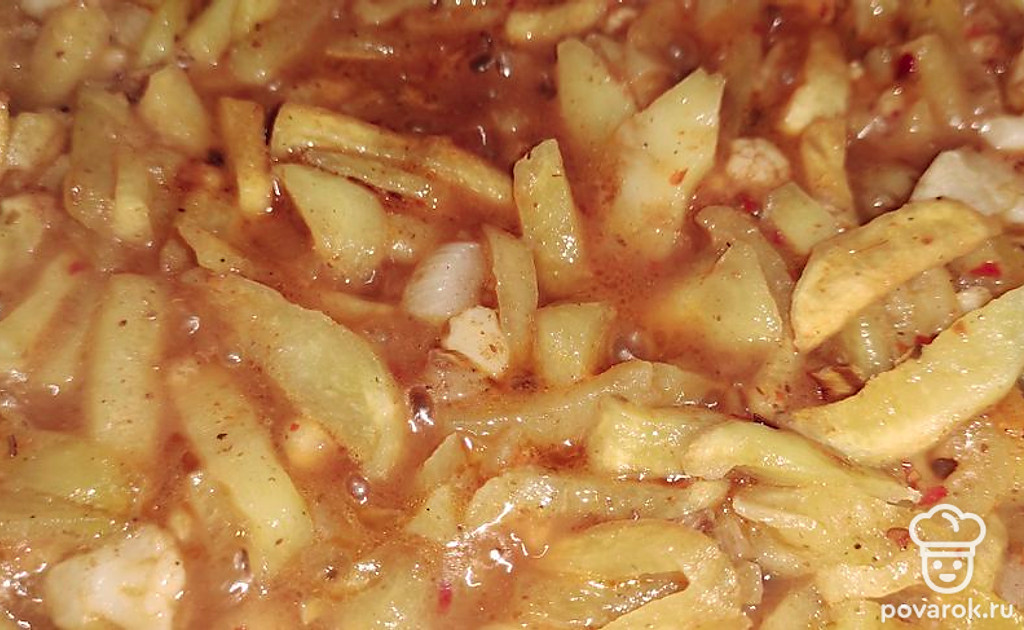 Залейте картофель семью с аджикой, добавьте соль по вкусу. Жарьте на сильном огне, пока не испарится жидкость. Обычно это занимает 5-7 минут, в зависимости от вида и мощности вашей плиты.