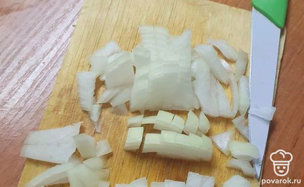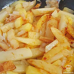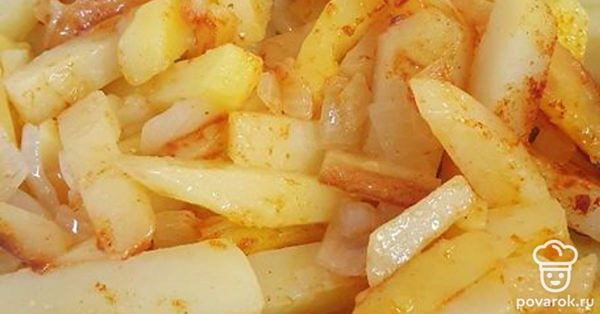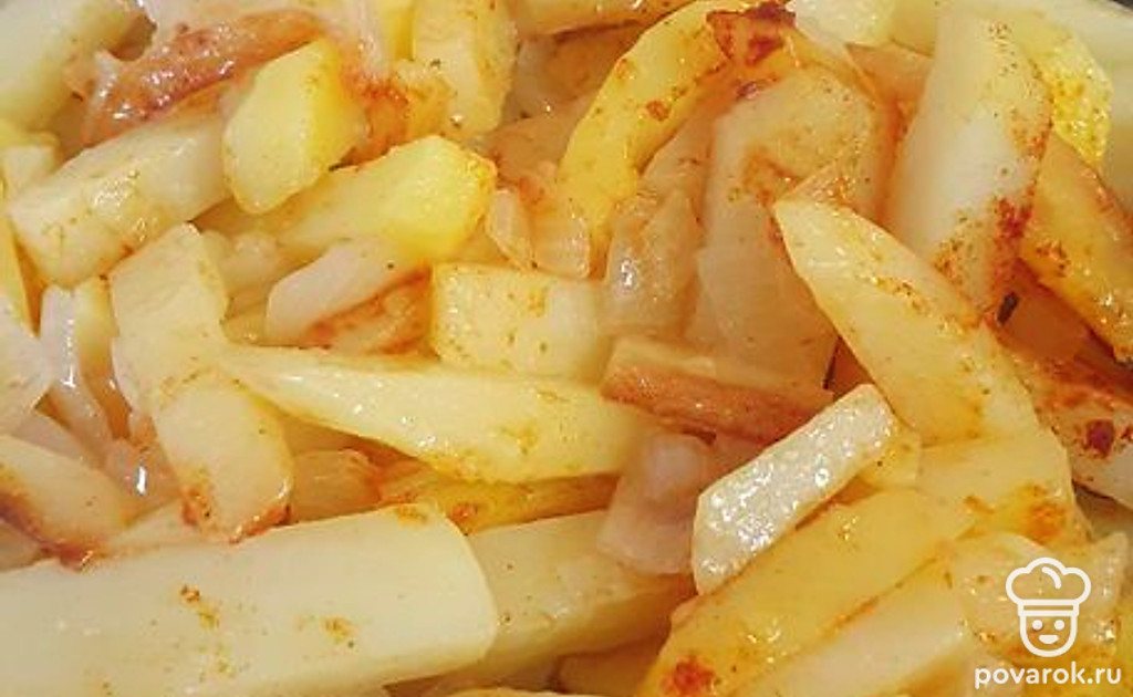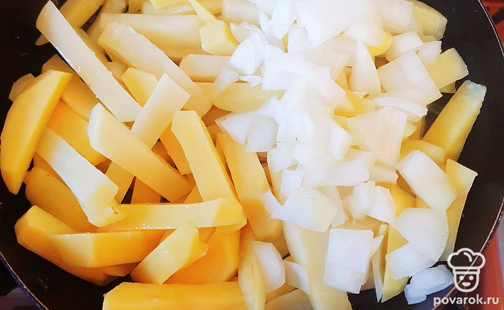 На растительном масле обжариваем картошку с луком под закрытой крышкой, примерно 15 минут.