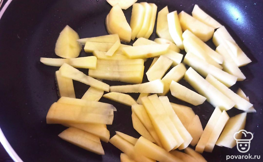 Картофель нарежьте ломтиками и обжарьте на подсолнечном масле в течение 10 минут, помешива.я