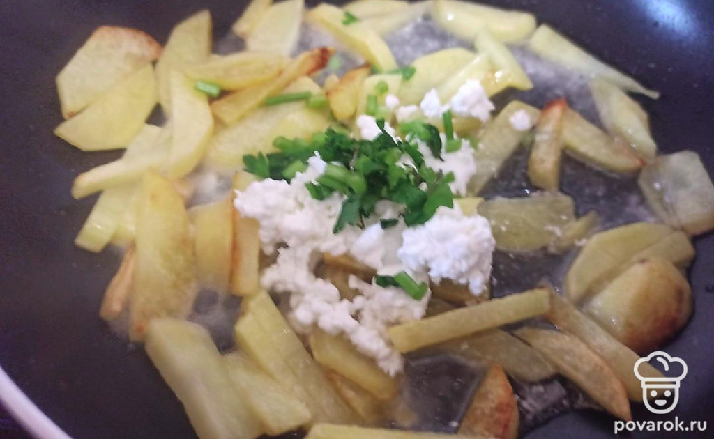 Добавьте творог, сметану, рубленую зелень и 50 миллилитров воды. Тушите на медленном огне под крышкой еще 10 минут, пока жидкость не испарится. Посолите по вкусу.