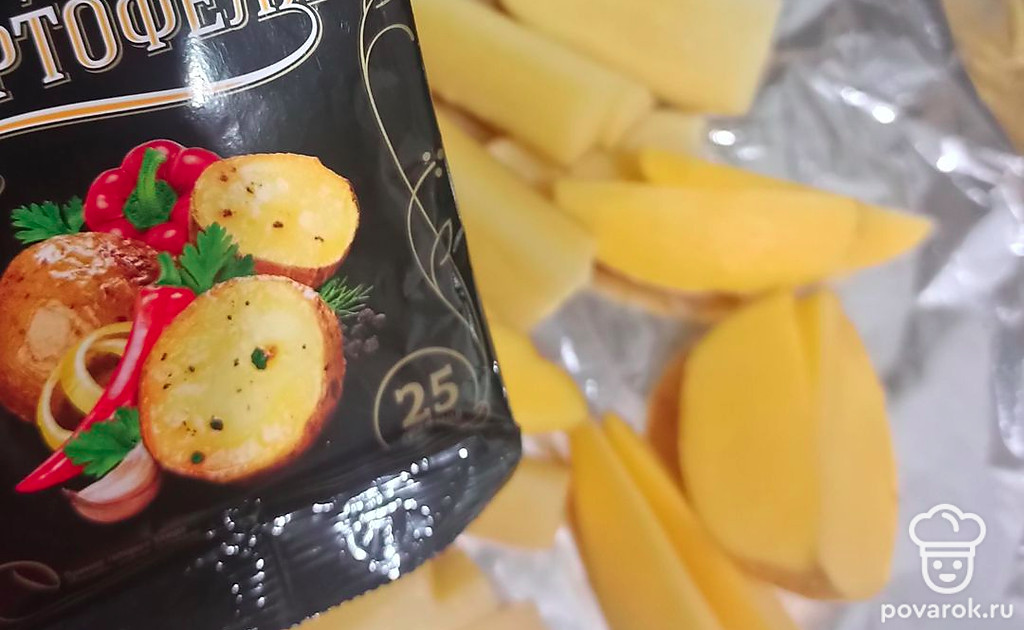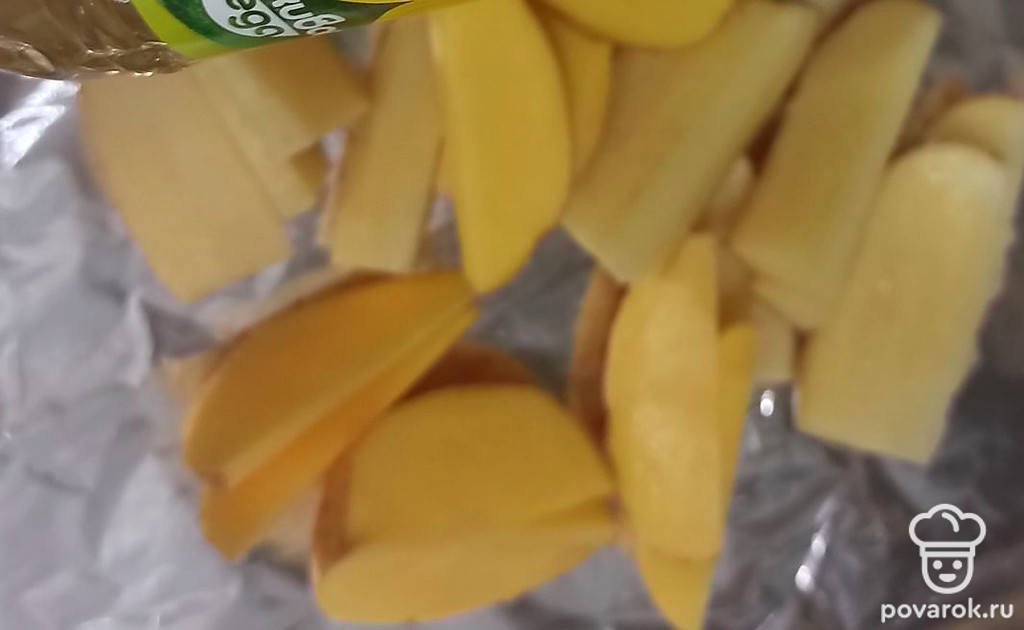 Нарезаем картошку на дольки, желательно не очень толстые, чтобы картофель хорошо пропекся. Выкладываем на фольгу, поливаем немного маслом.