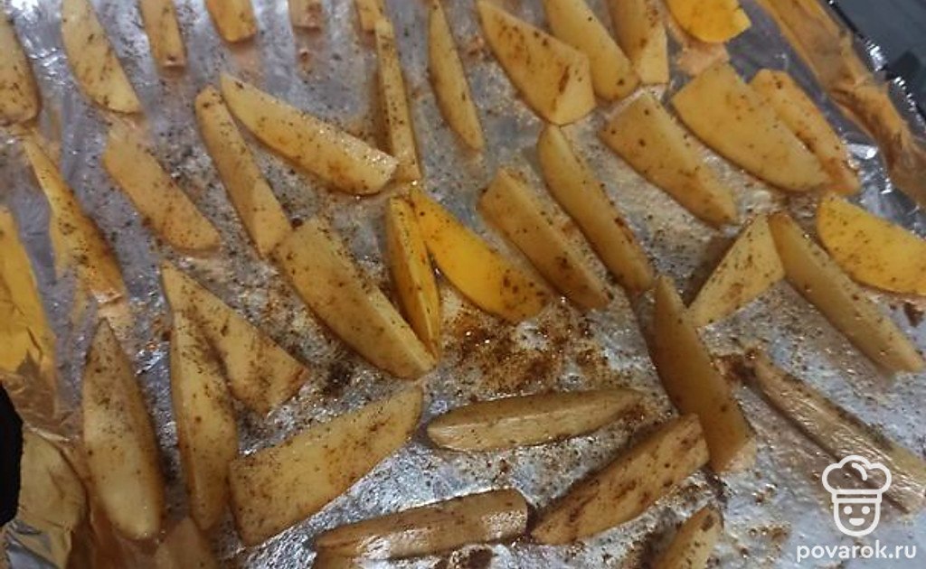 Все дольки перемешиваем, чтобы масло и приправы были на каждой дольке. Ставим каждый кусочек на ребро, чтобы красиво пропеклось с корочкой. Отправляем на 25 минут в заранее разогретую духовку при температуре 170-180 градусов.