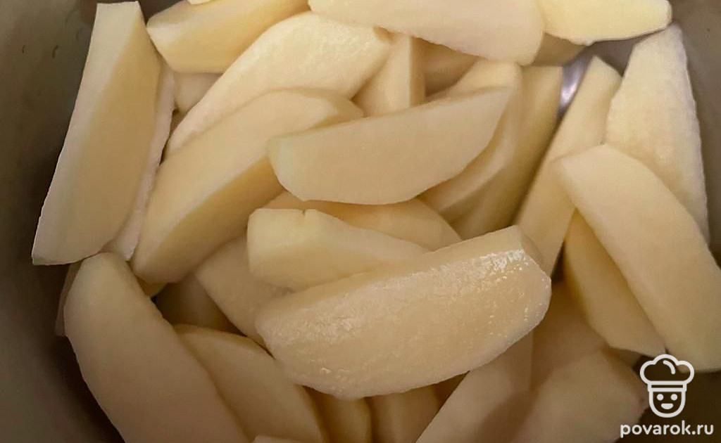Картофель очистите от кожуры и нарежьте на дольки. Залейте картошку кипятком, варите на среднем огне 2-3 минуты.