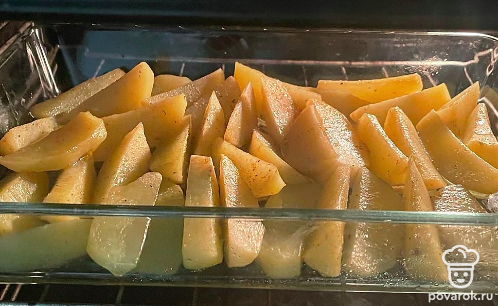 Выложите дольки картофеля на противень или в стеклянную форму. Запекайте при 180 градусах минут 30-35.