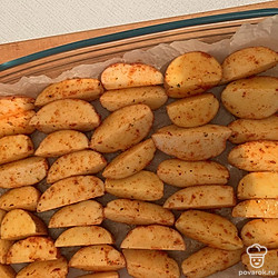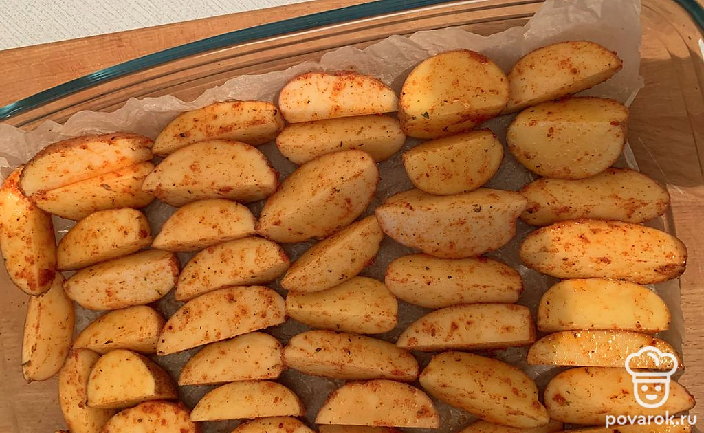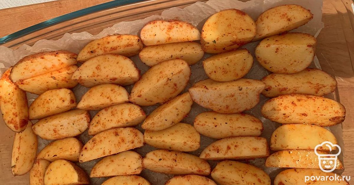 Картофель выложить в форму для запекания на пергамент. Выпекать в духовке до готовности.
