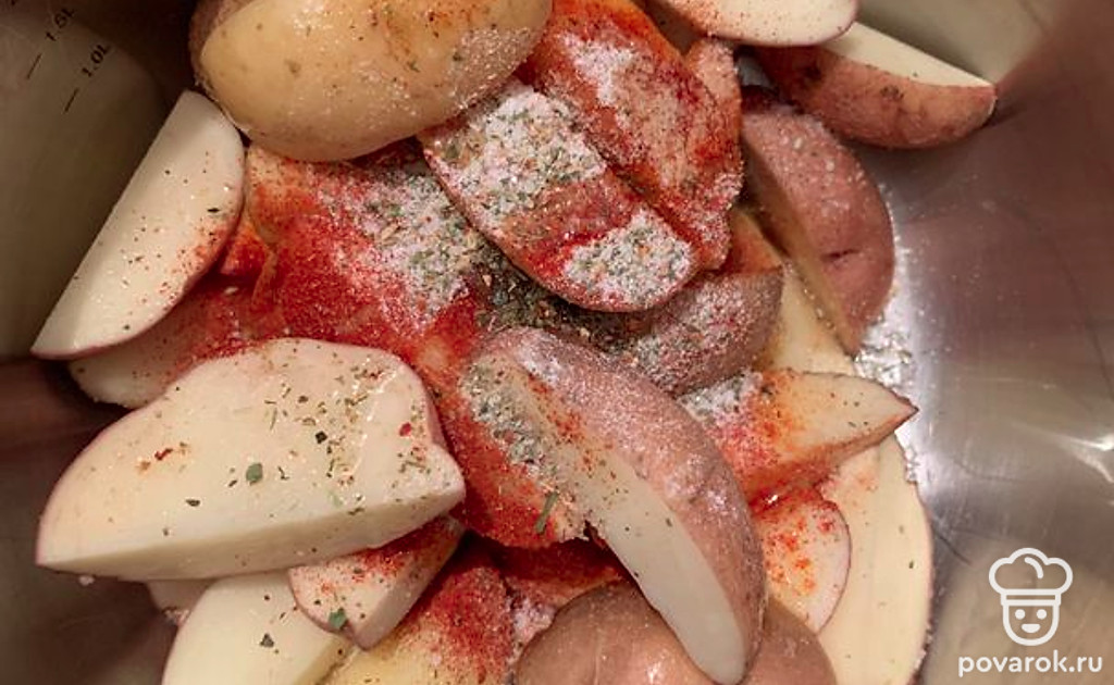 Нарезать картошку дольками. К ней добавить паприку сладкую, паприку копченую, сушеный чеснок, смесь трав, соль и растительное масло. Все хорошо перемешать. Дать картофелю постоять и насытиться ароматами специй 30 минут.