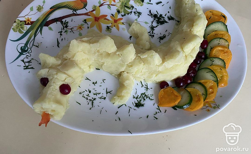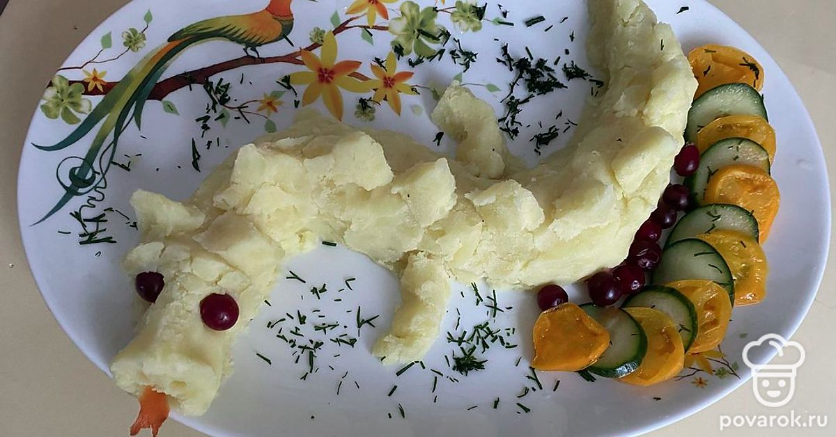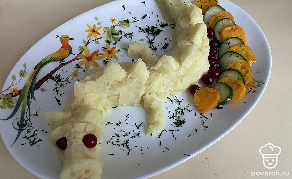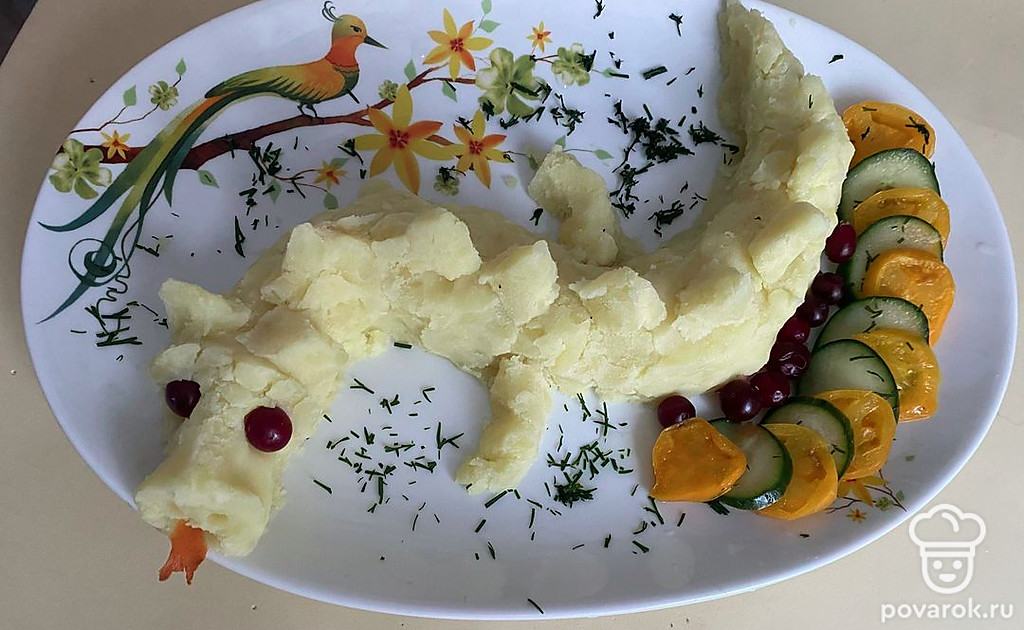 Подавайте пюре в форме дракона с любыми овощами, свежими или маринованными, а также с котлетами, тефтелями. При желании, пюре можно полить любимым соусом. Приятного аппетита!