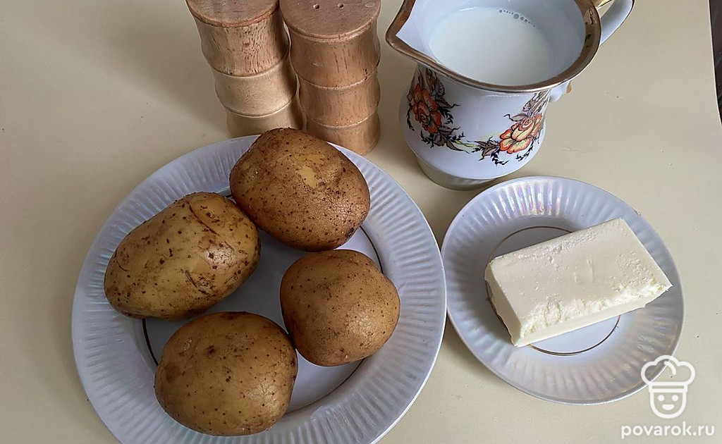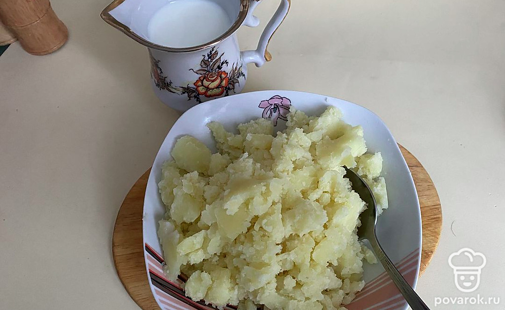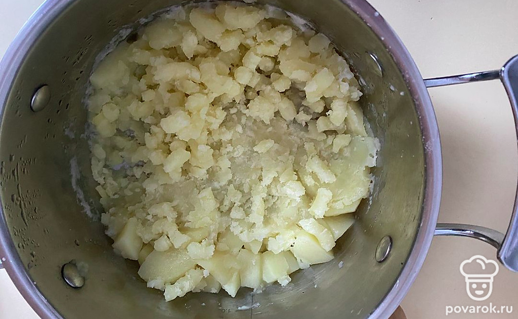 Слейте воду с кастрюли, разомните толкушкой картофель в пюре.