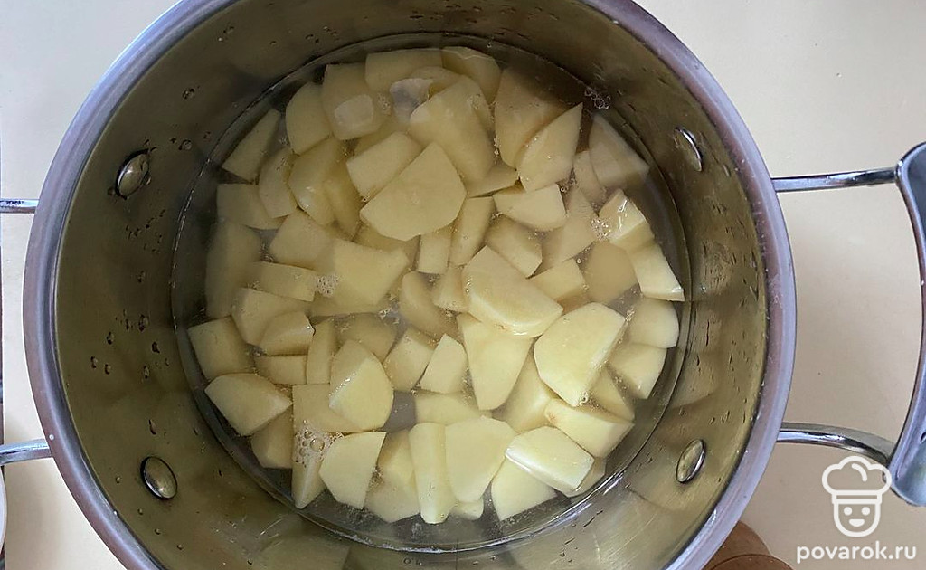 Нарежьте картофель на небольшие кусочки и отварите в подсоленной воде до готовности.