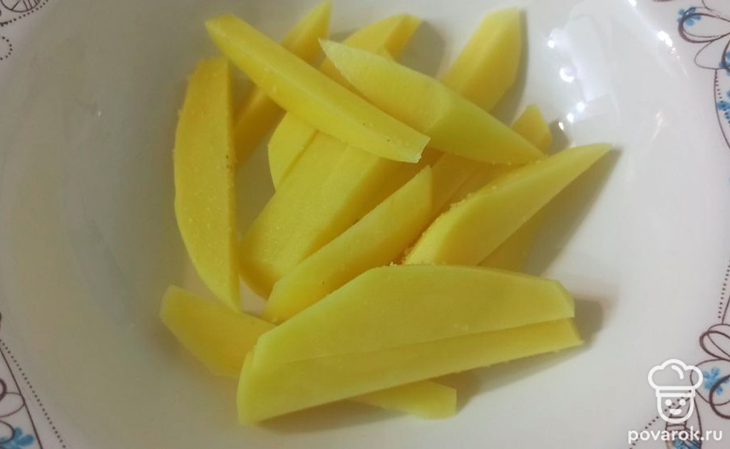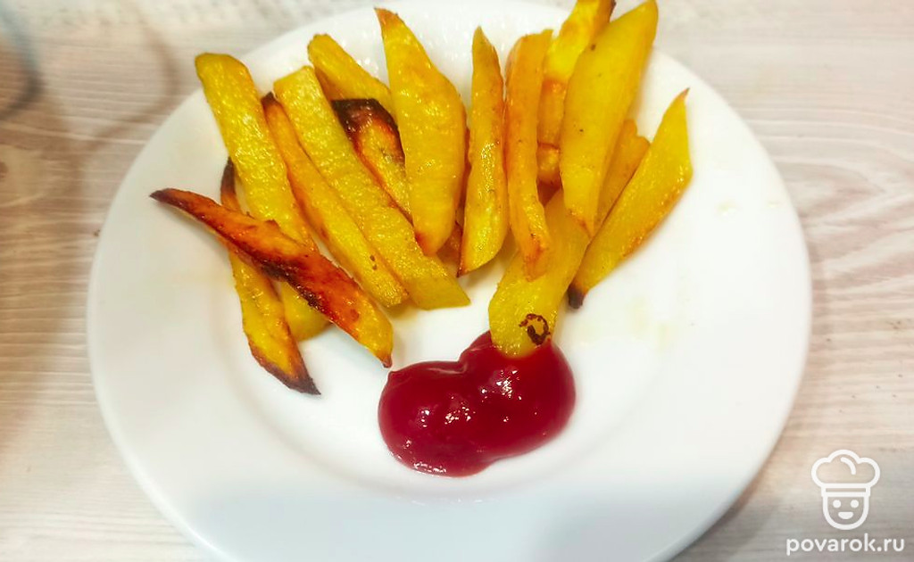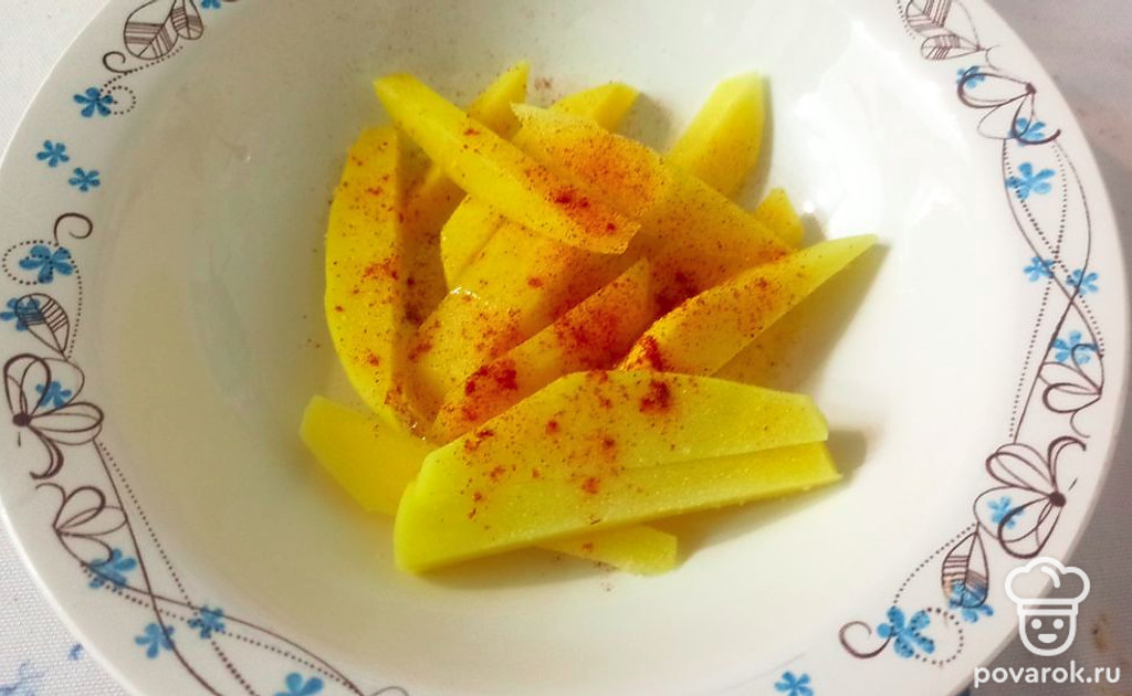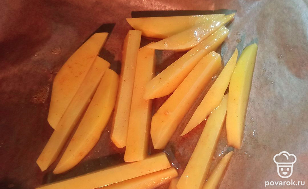 Выложите картошку на противень, застеленный пергаментной бумагой. Поставьте в разогретую до 180 градусов духовку на 30 минут.
