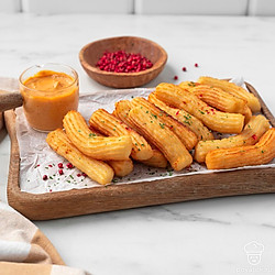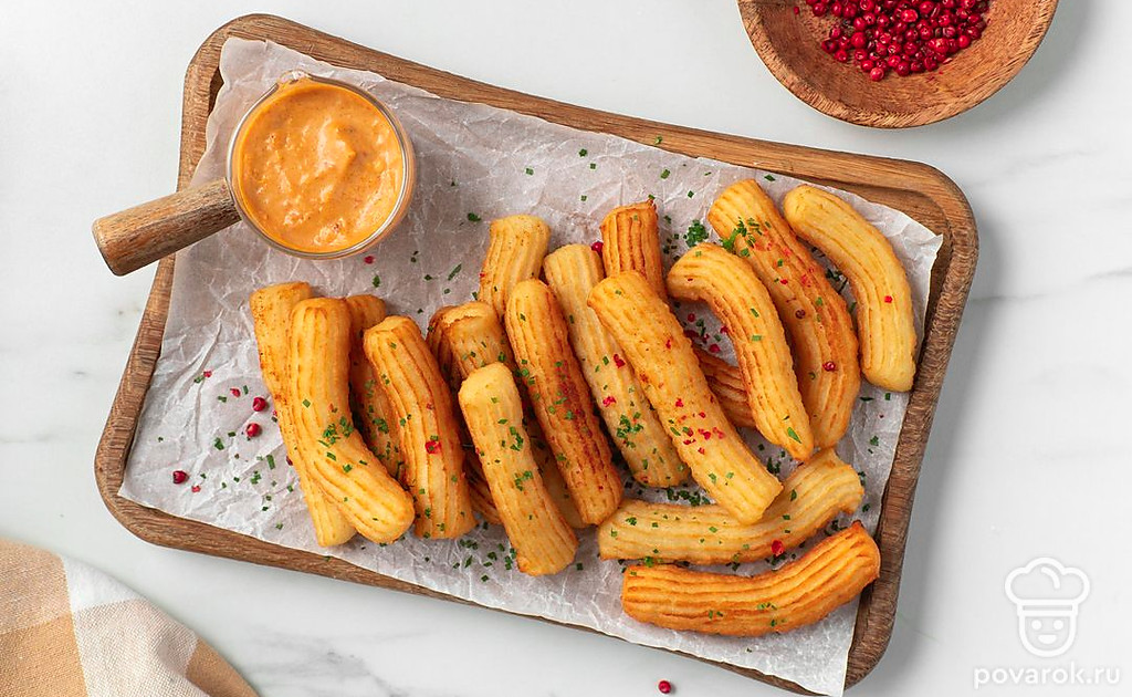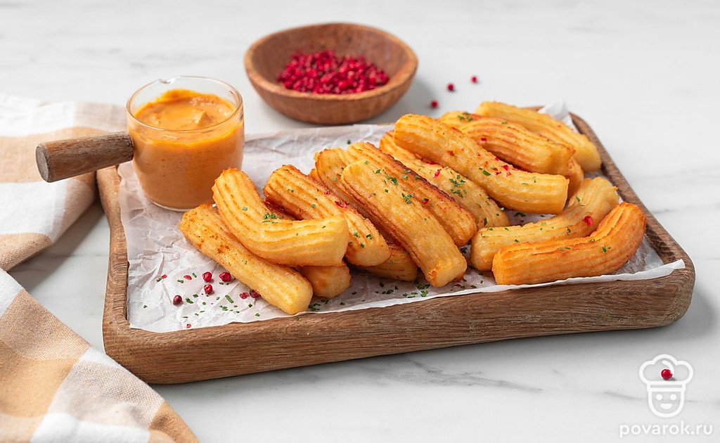 Протертый через сито вареный картофель полностью смешается с заварным тестом на сливочном масле. С добавлением яйца смесь превратится в мягкую густую массу, подходящую для классических испанских чуррос. Отсадите их из кондитерского мешка в горячее растительное масло, обжарьте до золотистой корочки и подайте с острым сырным соусом.