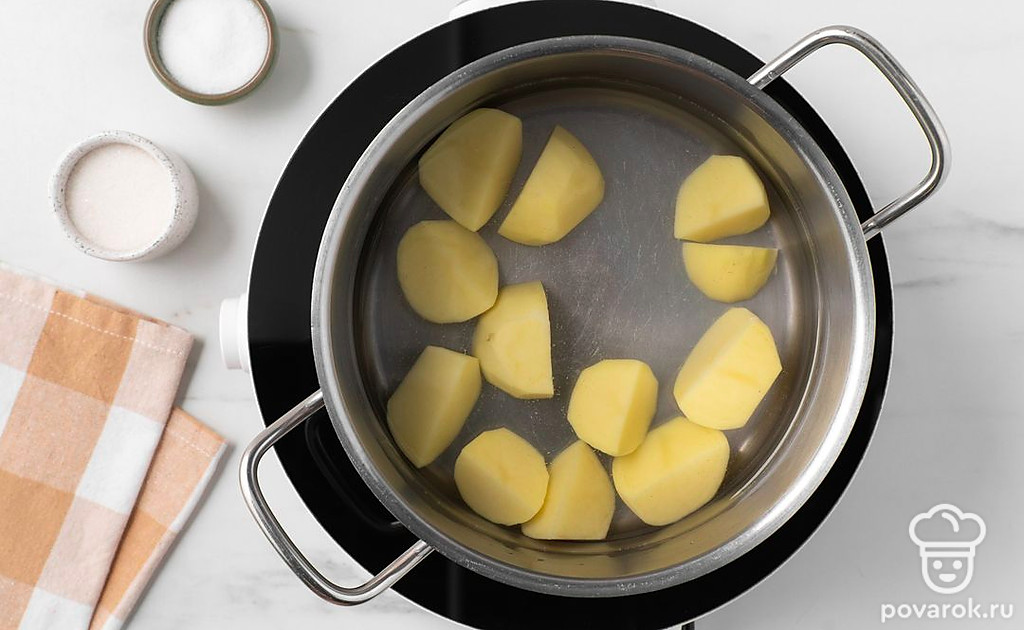Разрежьте клубни на 4 части, положите их в кастрюлю. Залейте водой, чтобы она полностью закрывала картофель. Поставьте на сильный огонь и доведите воду до кипения.