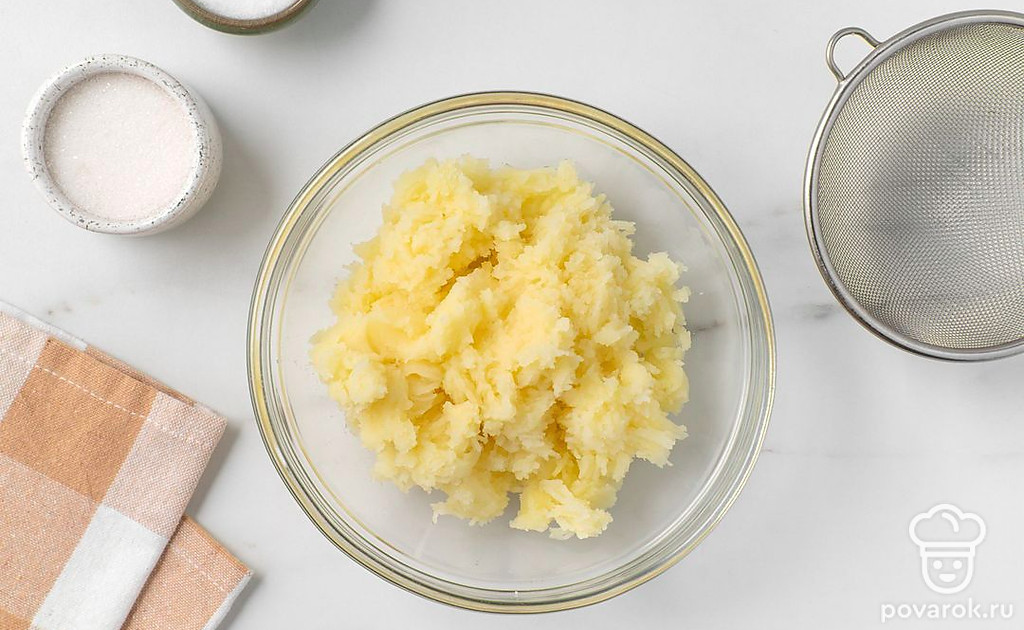 Уменьшите огонь до среднего и варите картофель в течение 15-20 минут до готовности. Слейте из кастрюли воду и дайте картофелю немного остыть. Небольшими порциями выложите картофель в сито и протрите его лопаткой в миску.