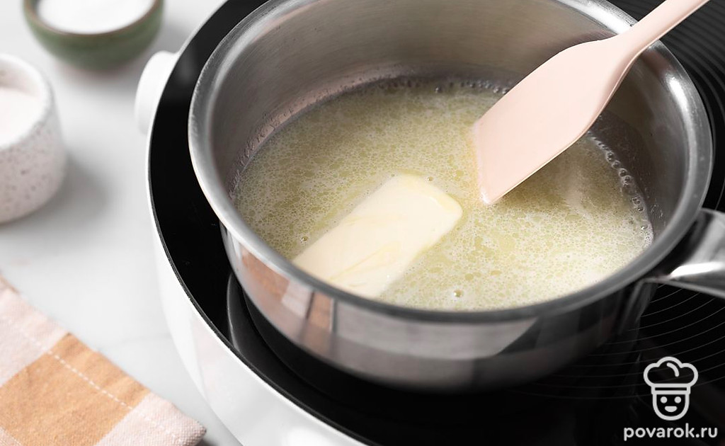 Соедините в сотейнике ¼ стакана воды, 1 ст.л. сливочного масла и 1 ч.л. сахара. Нагрейте все на слабом огне, помешивая, 2-3 минуты до однородной консистенции.