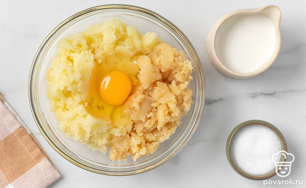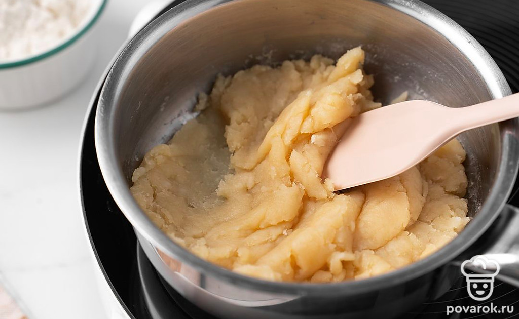 Переложите заварное тесто в миску с картофельным пюре, разбейте яйцо и вымесите густое мягкое тесто. Переложите тесто в кондитерский мешок.