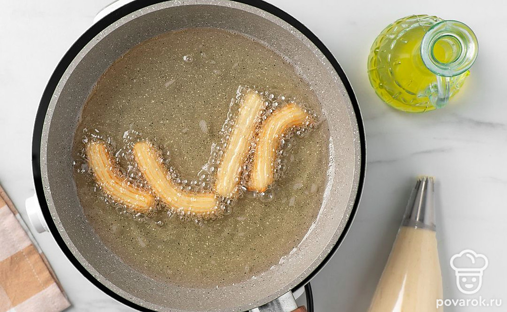 Налейте в глубокую сковороду растительное масло, нагрейте его на сильном огне. Отсадите из кондитерского мешка в горячее масло полоски чуррос длиной около 6-7 см. Жарьте чуррос до золотистого цвета около 3 минут. При помощи шумовки переложите обжаренные чуррос на тарелку с бумажными полотенцами, чтобы избавиться от лишнего масла.