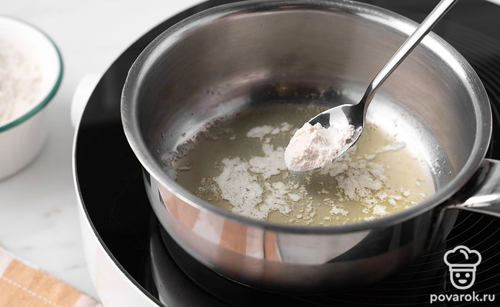 Поставьте сотейник на средний огонь, положите в него 0,5 ст.л. сливочного масла и растопите его до жидкого состояния. Всыпьте в масло 0,5 ч.л. муки, хорошо перемешайте.