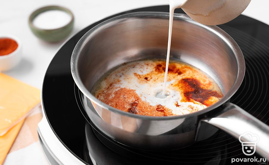 Налейте в сотейник молоко, всыпьте 0,5 ч.л. сахара, соль и молотый перец чили. Размешайте до однородного состояния. Положите в получившийся соус ломтики плавленого сыра. Прогрейте, помешивая, пока сыр полностью не расплавится.