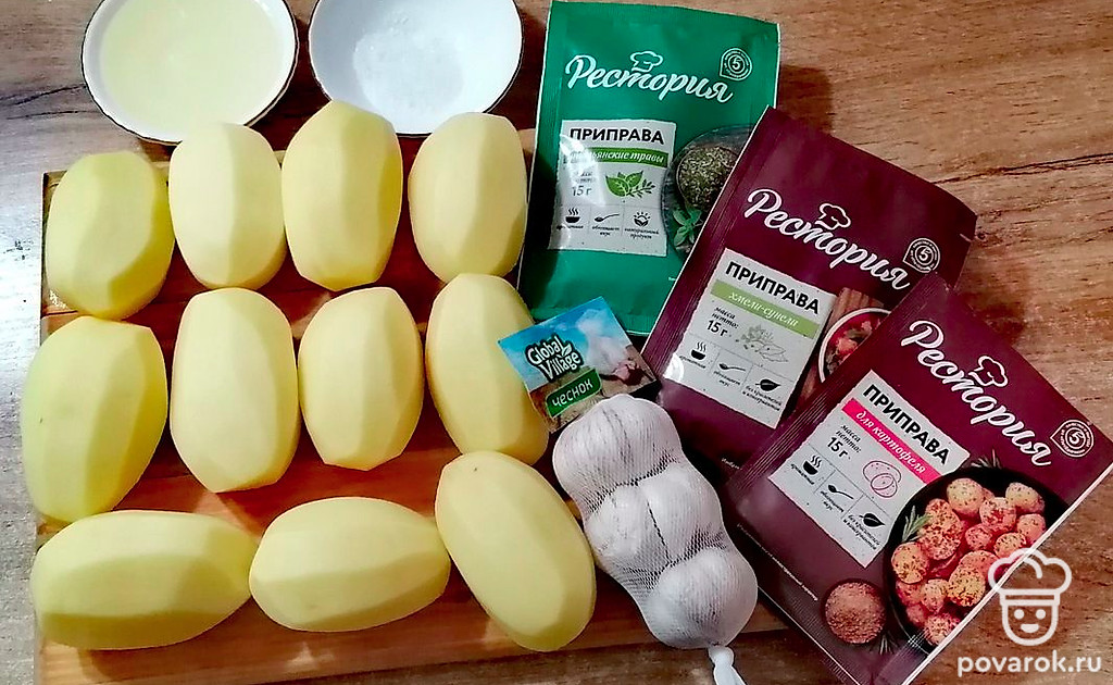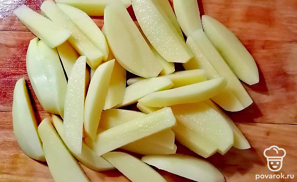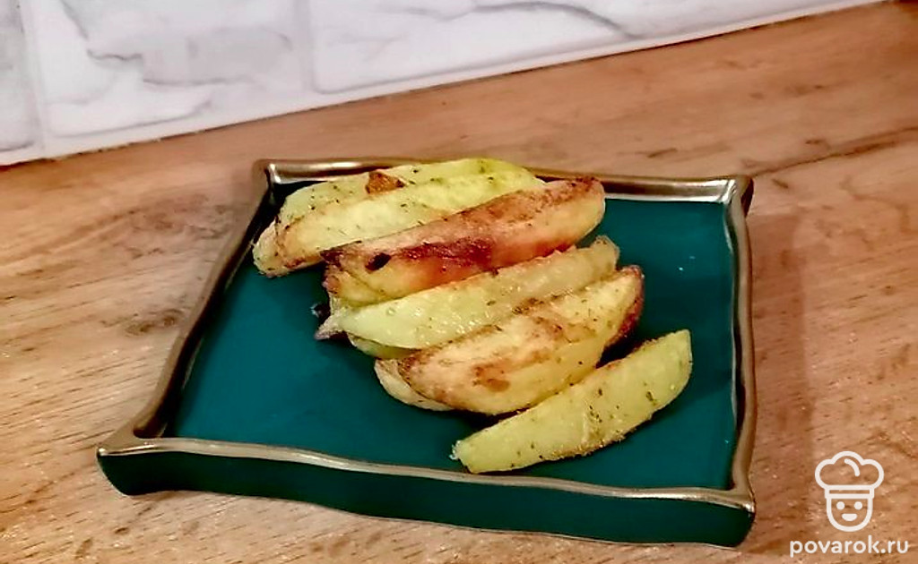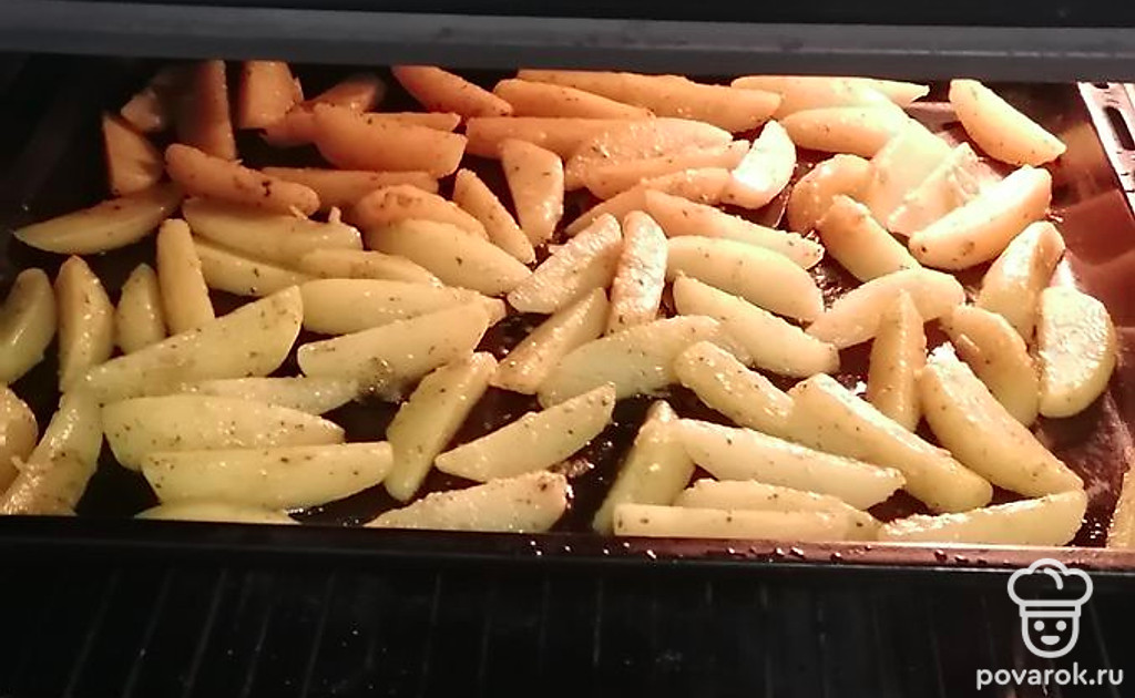 Распределите равномерно картофельные дольки на противне. Поставьте в разогретую до 200 градусов духовку. Запекайте до золотистого цвета.