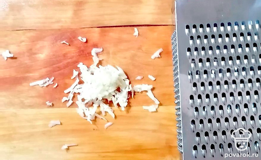 Пока картофель варится, быстро приготовьте заправку. Чеснок натрите на мелкой терке.