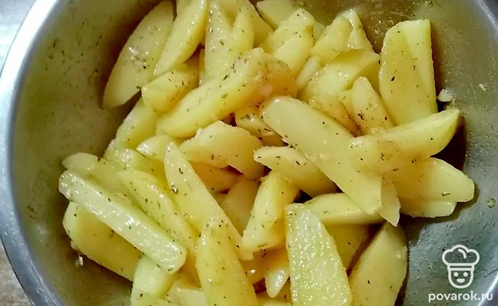 Слейте воду. Выложите картофельные дольки в миску с заправкой. Хорошо перемешайте.