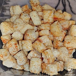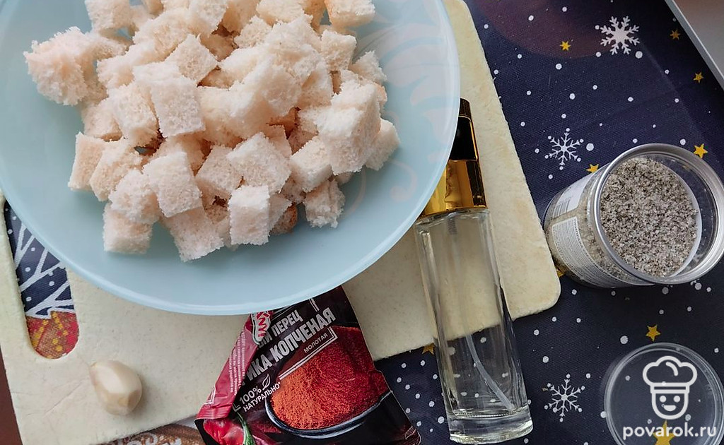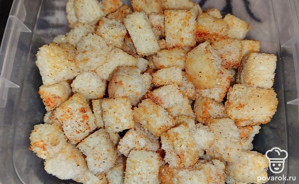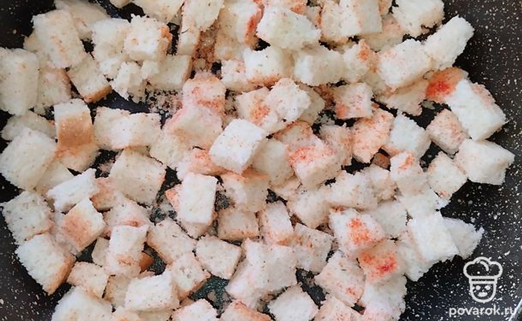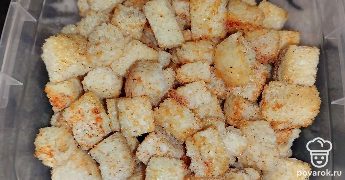 Сухарики из белого хлеба с копченой паприкой, чесноком и адыгейской солью можно использовать как самостоятельное блюдо или добавлять в суп.