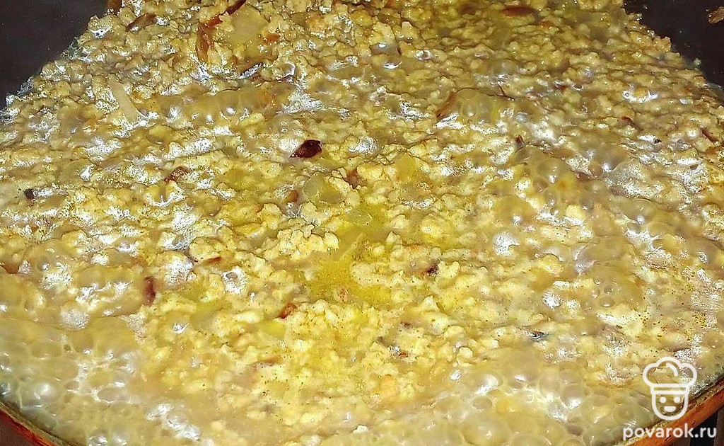 Обжарьте ее с соевым фаршем на растительном масле. Добавьте воду, соль и специи. Томите 10 минут.