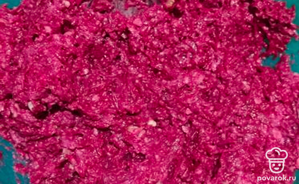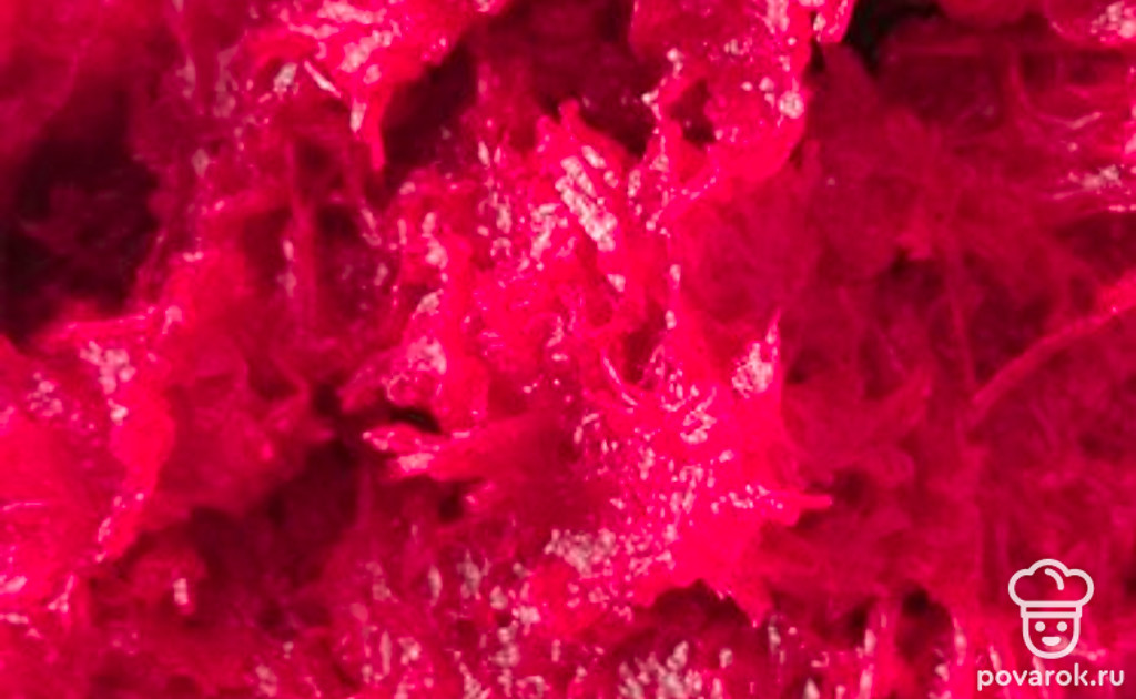 Отварить свеклу, очистить, натереть на мелкой терке.