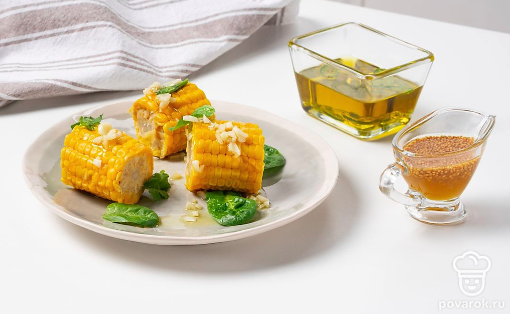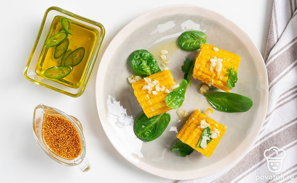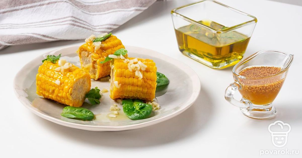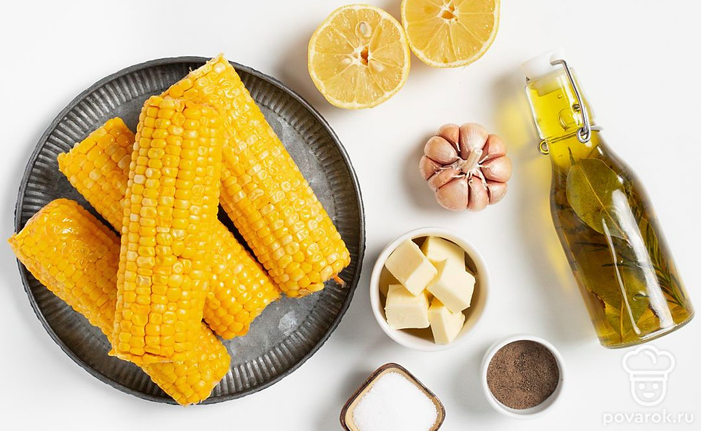 В этом рецепте кукуруза прогревается в воде с лимонным соком, солью и перцем. В результате получается вкусное кисло-сладкое блюдо с приятным ароматом и изысканным вкусом. А соус из чеснока и двух видов масла придает кукурузе пикантную остроту. Для готовки выбирайте молодую кукурузу светло-желтого оттенка с зернами одинакового размера.