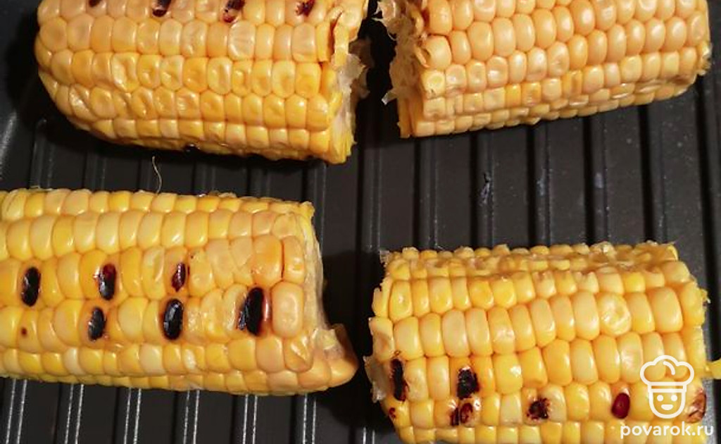 Кукурузу разрезать на 2 части. Смазать растительное маслом и обжарить на сковороде гриль.