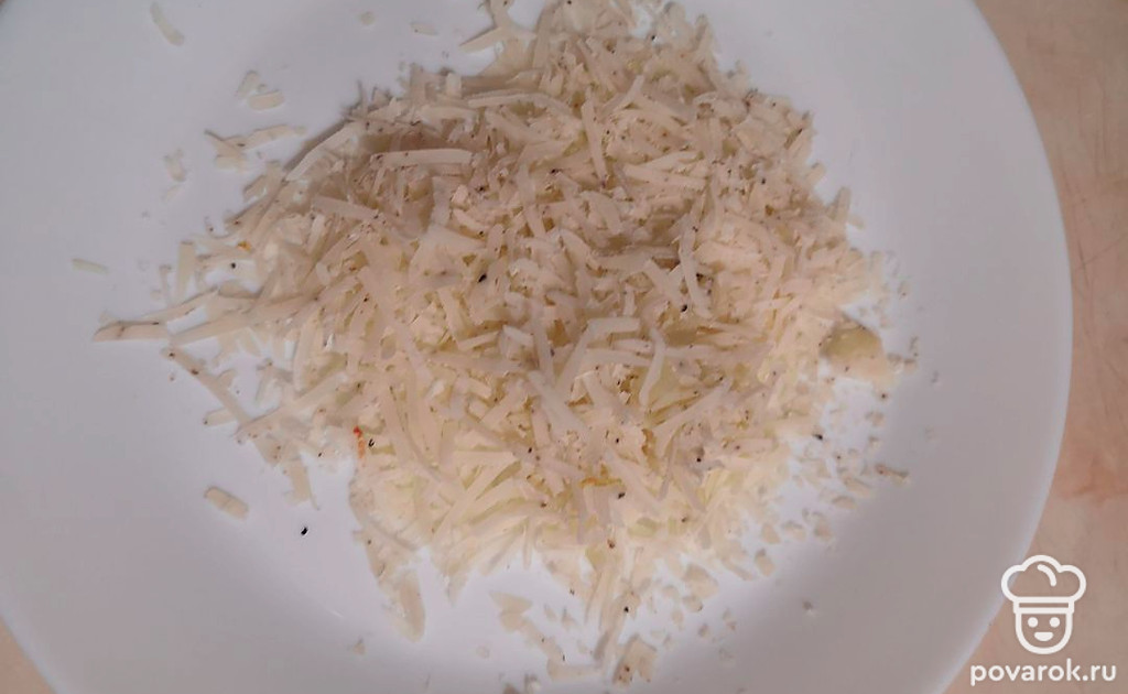 Пармезан натереть на мелкой терке.