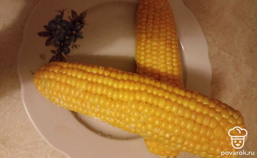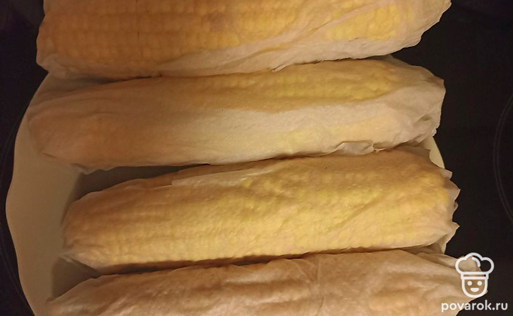 Заворачиваем початки в полотенце, смачиваем водой. Отправляем в микроволновку на 5 минут при максимальной мощности.