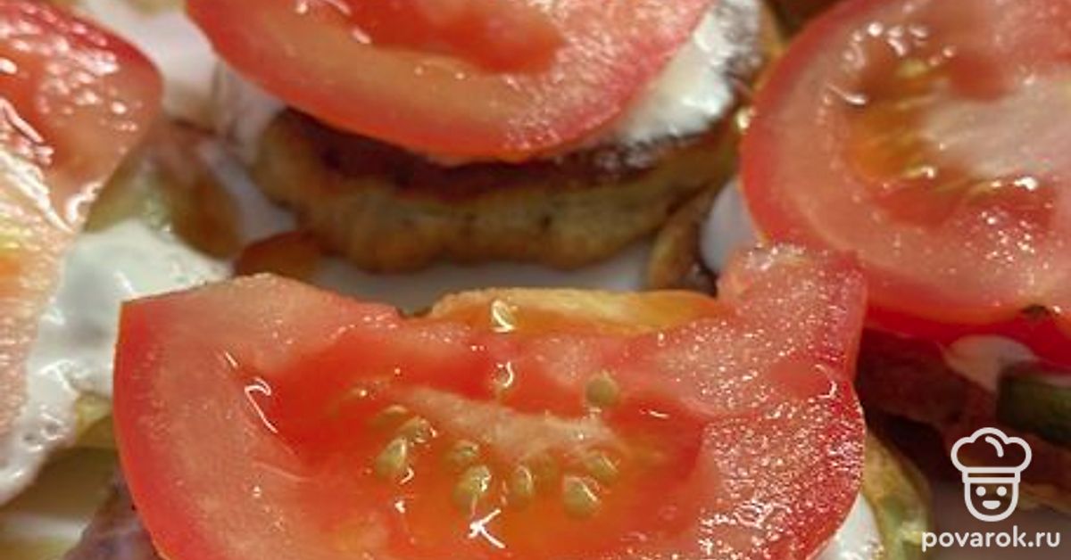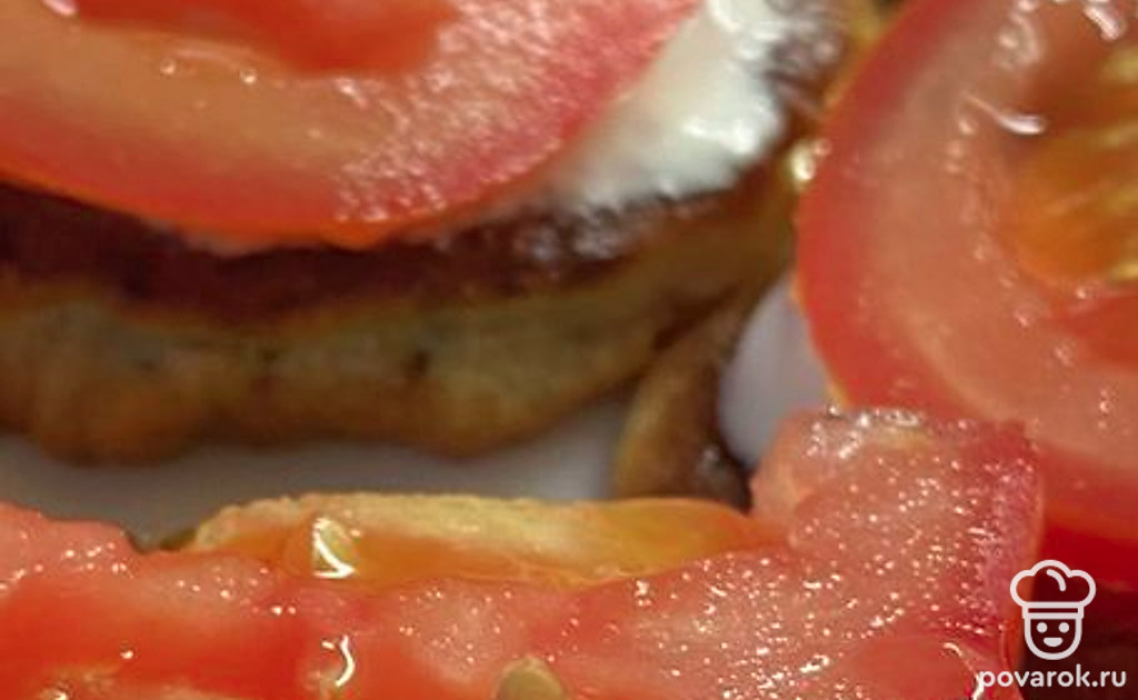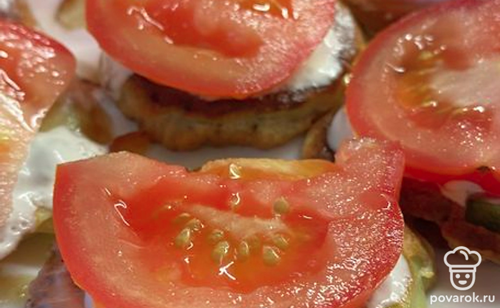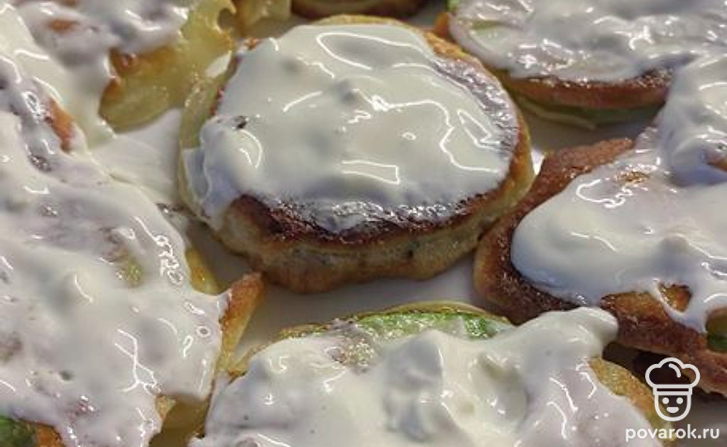 Готовые кабачки выкладываем на тарелку и смазываем чесночным соусом, для приготовления которого, мы смешиваем оставшуюся сметану с чесноком.