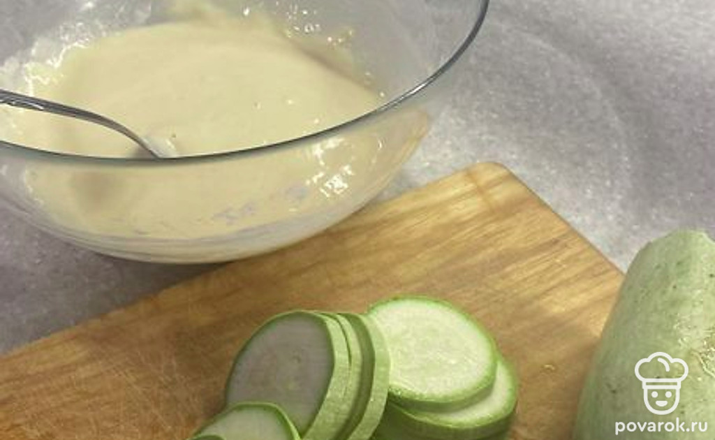 Нарезаем кабачок и готовим кляр, смешав в глубокой посуде яйца, муку, несколько ложек сметаны и специи (консистенция должна получиться густая).