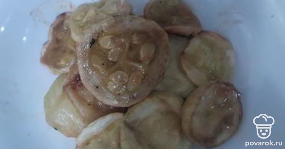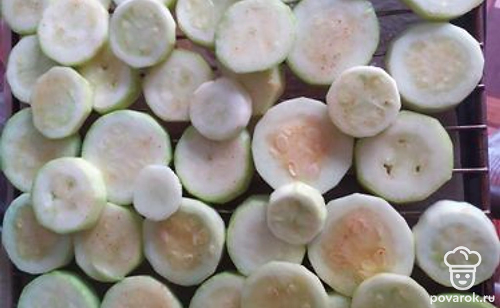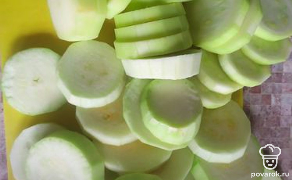 Кабачок лучше брать молоденький, очищаем от кожуры, нарезаем кружочками.