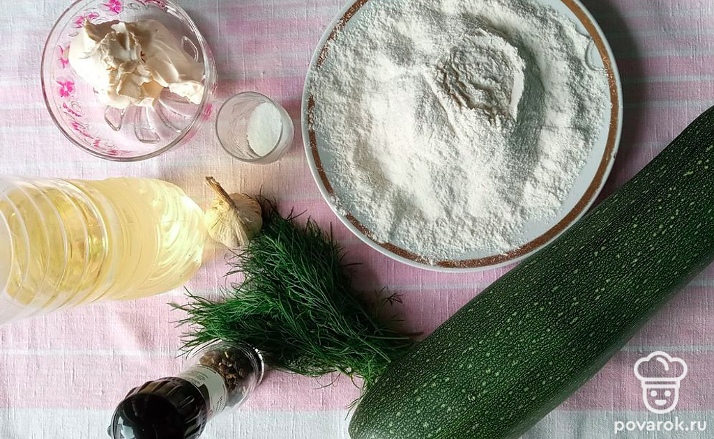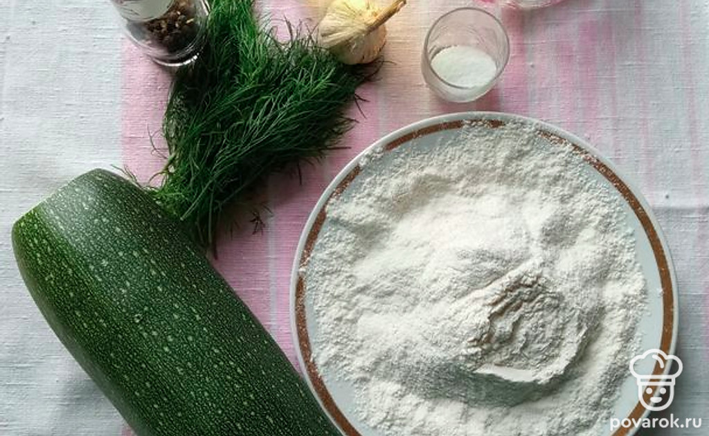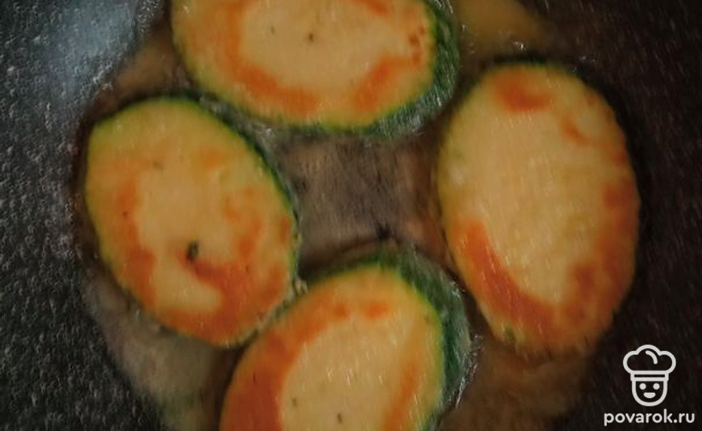 Слить жидкость с кабачка. Дольки обвалять в муке и пережарить с обеих сторон.