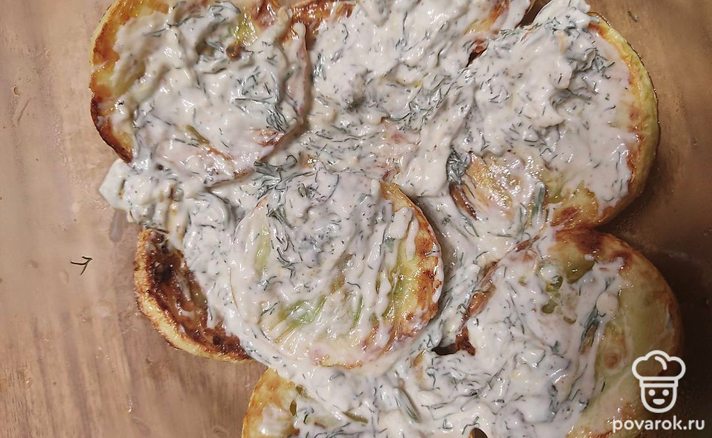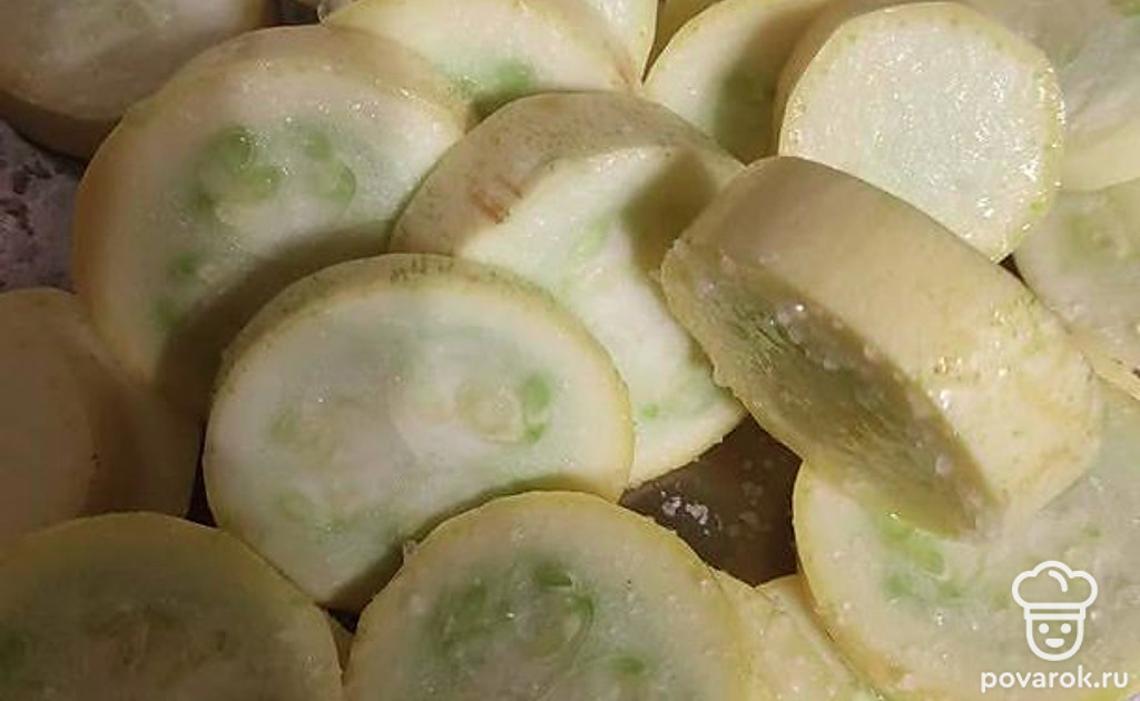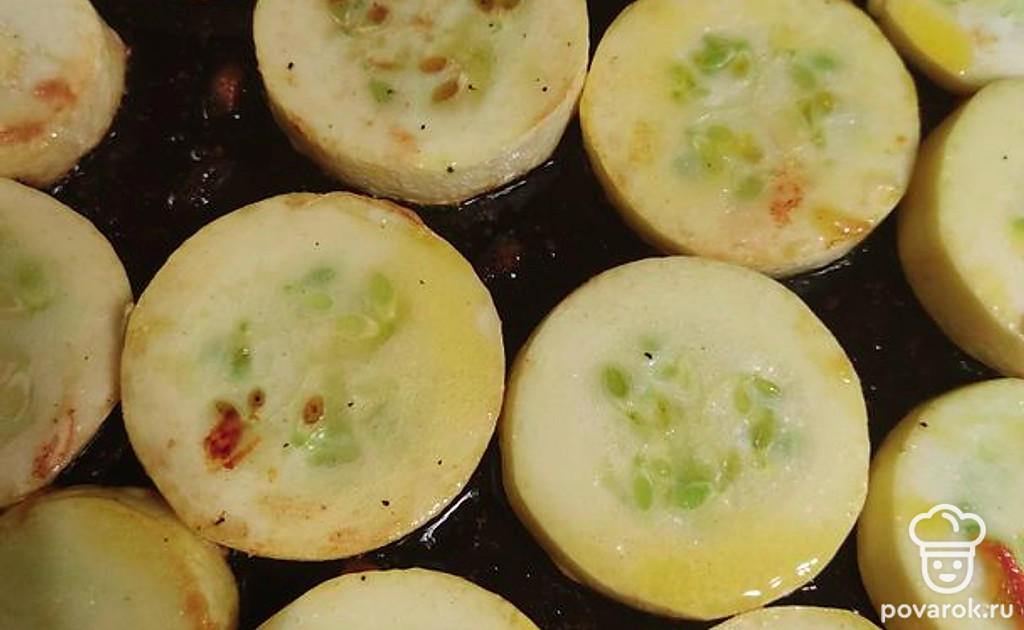 Очень вкусное блюдо как гарнир и как самостоятельное. Подавать на тарелке, украшенной листом салата, сверху выложить кабачки.