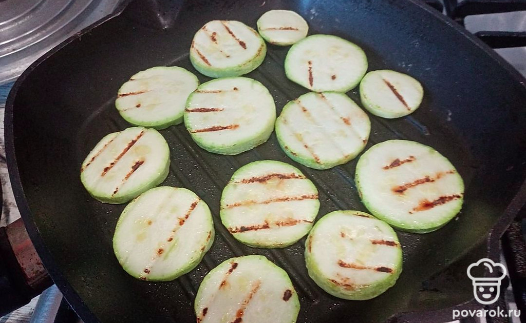 На грильной сковороде обжарьте кабачки, предварительно их нарезав на кружочки и посолив.