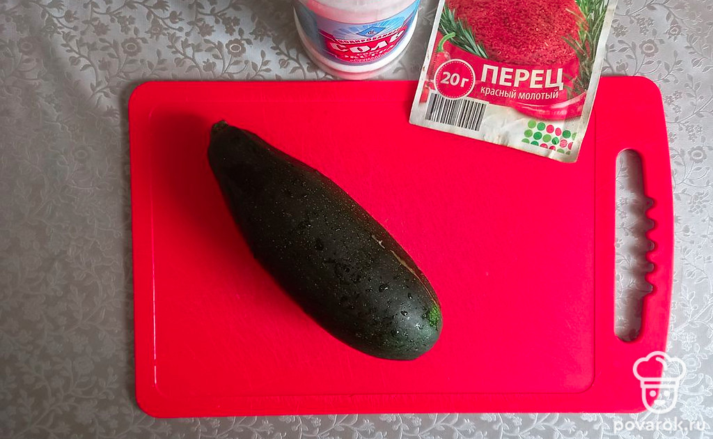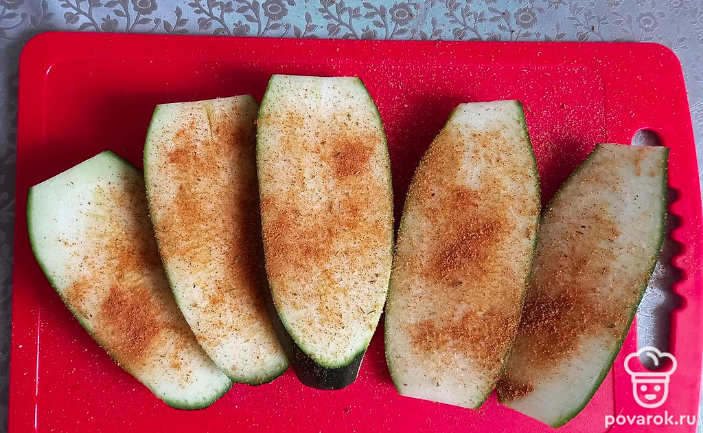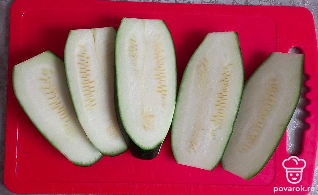 Кабачок нарежьте одинаковыми по толщине пластами.