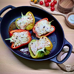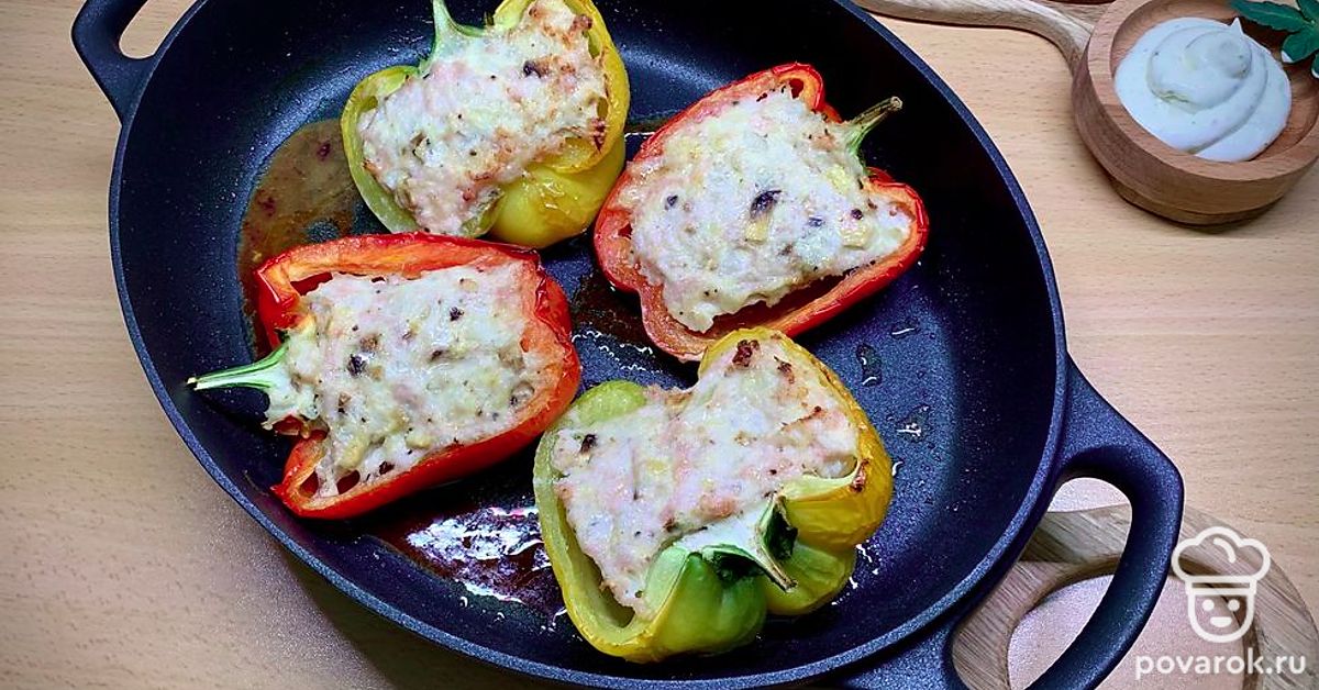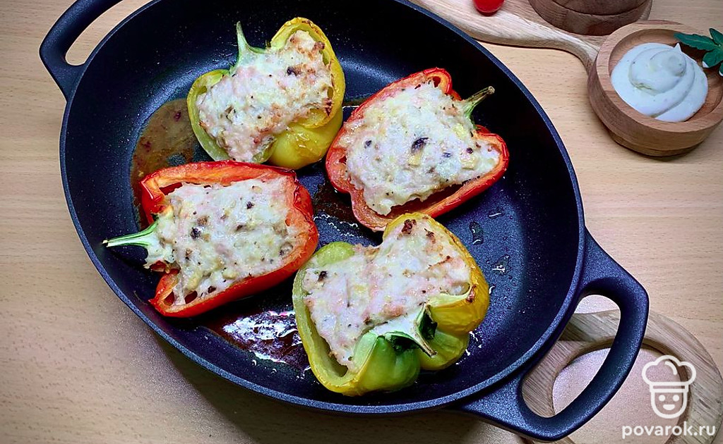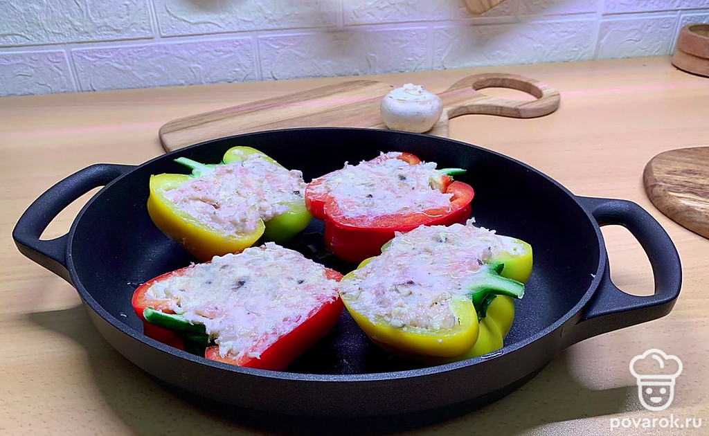 Половинки перца плотно нафаршируйте. Перец выложите на противень, заранее смазанный растительным маслом.
