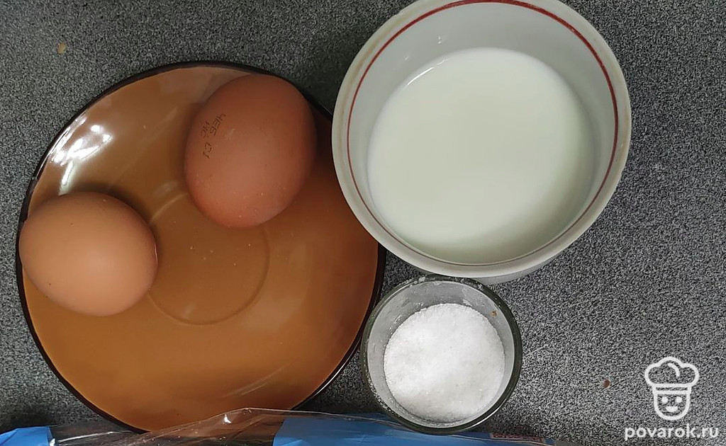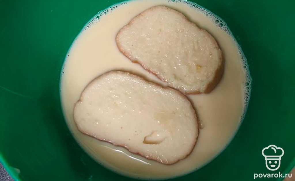 В миску налейте молоко и вбейте яйца. Слегка взбейте, добавьте соль. Окуните хлеб с обеих сторон.