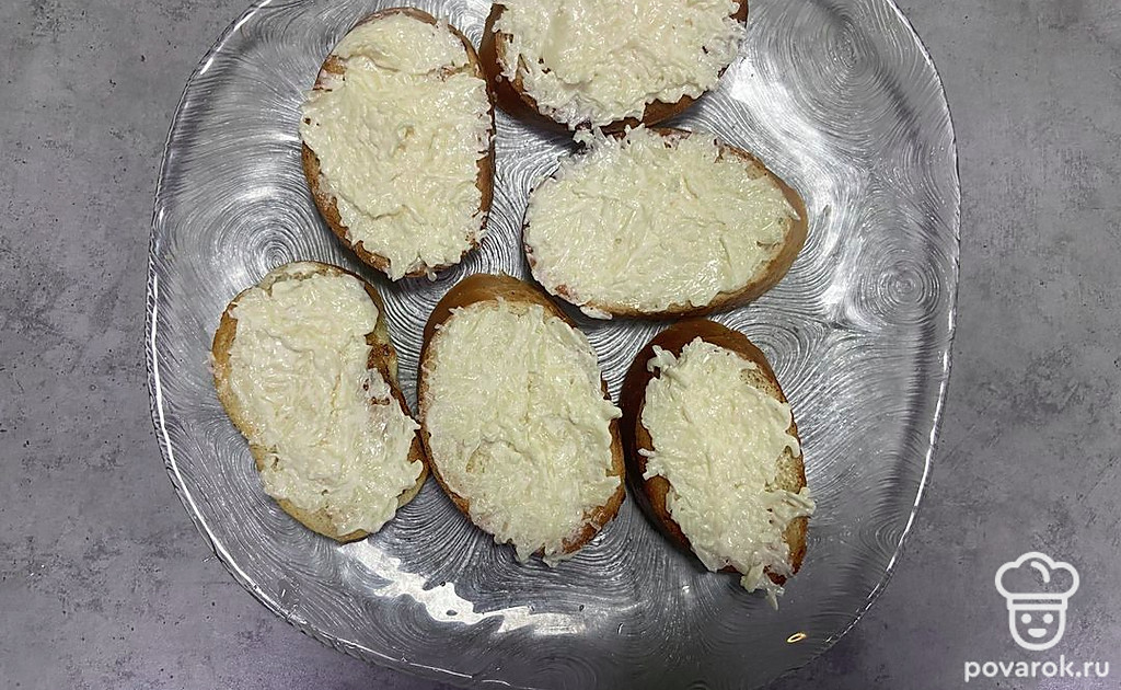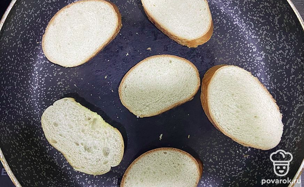 Ломтики хлеба подсушите на сковороде до хрустящей корочки.