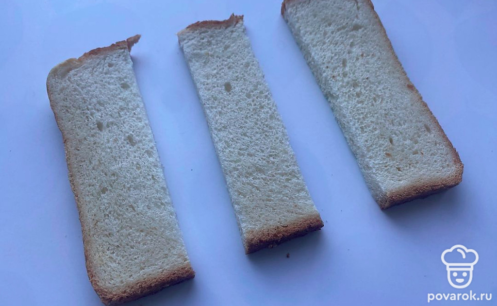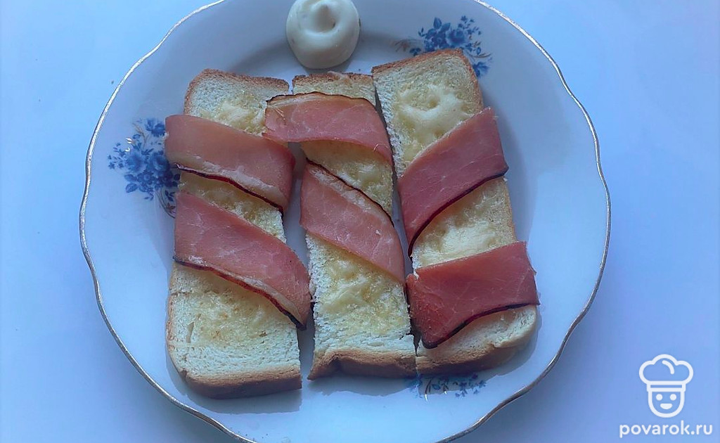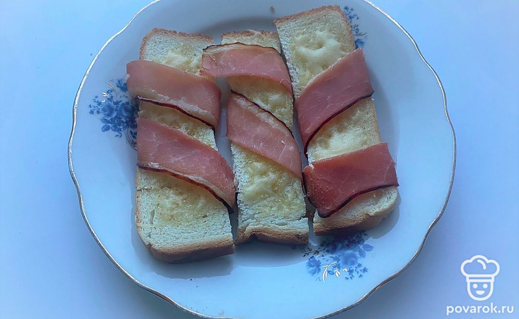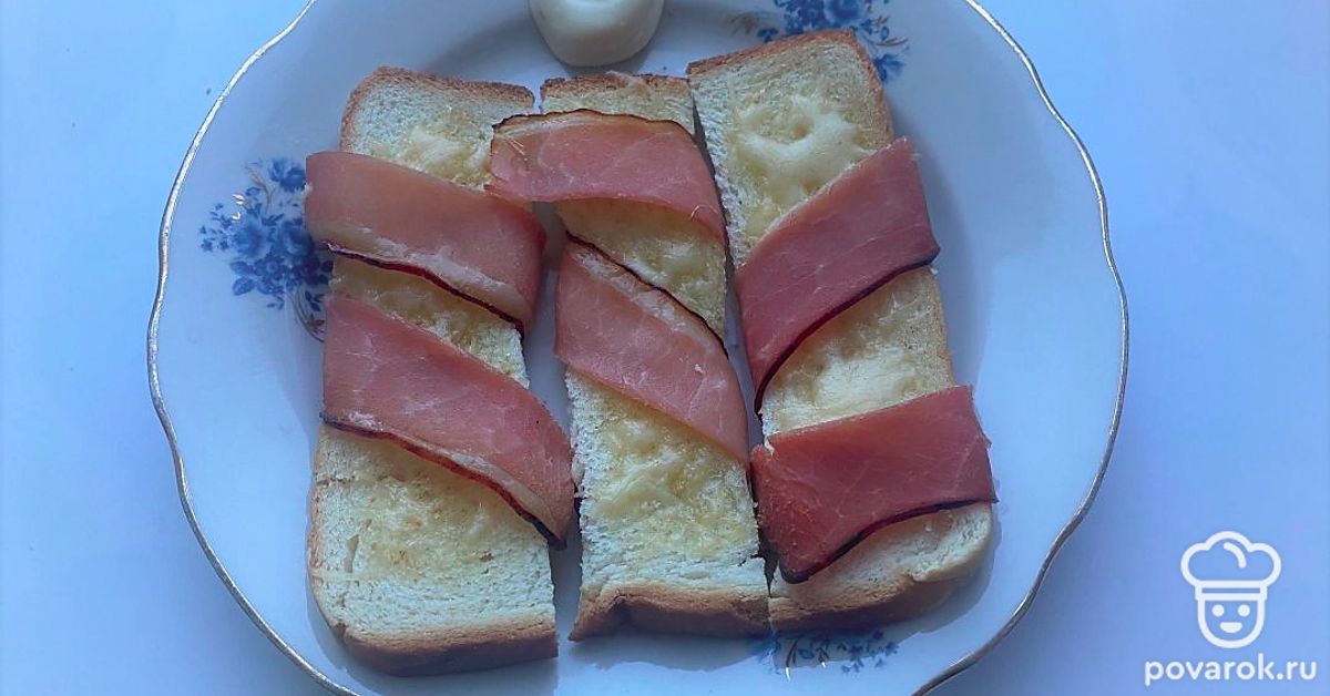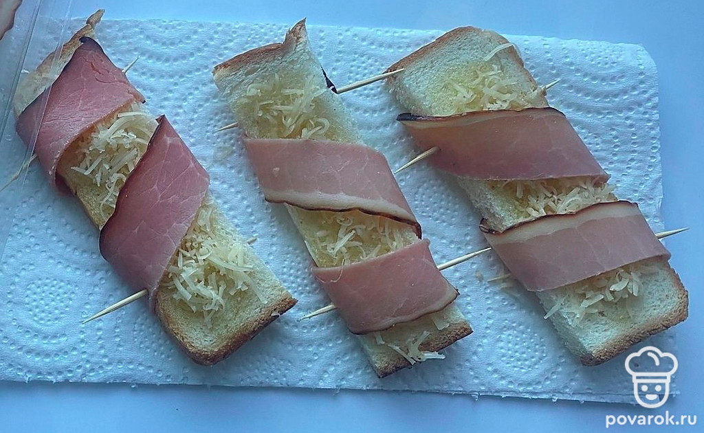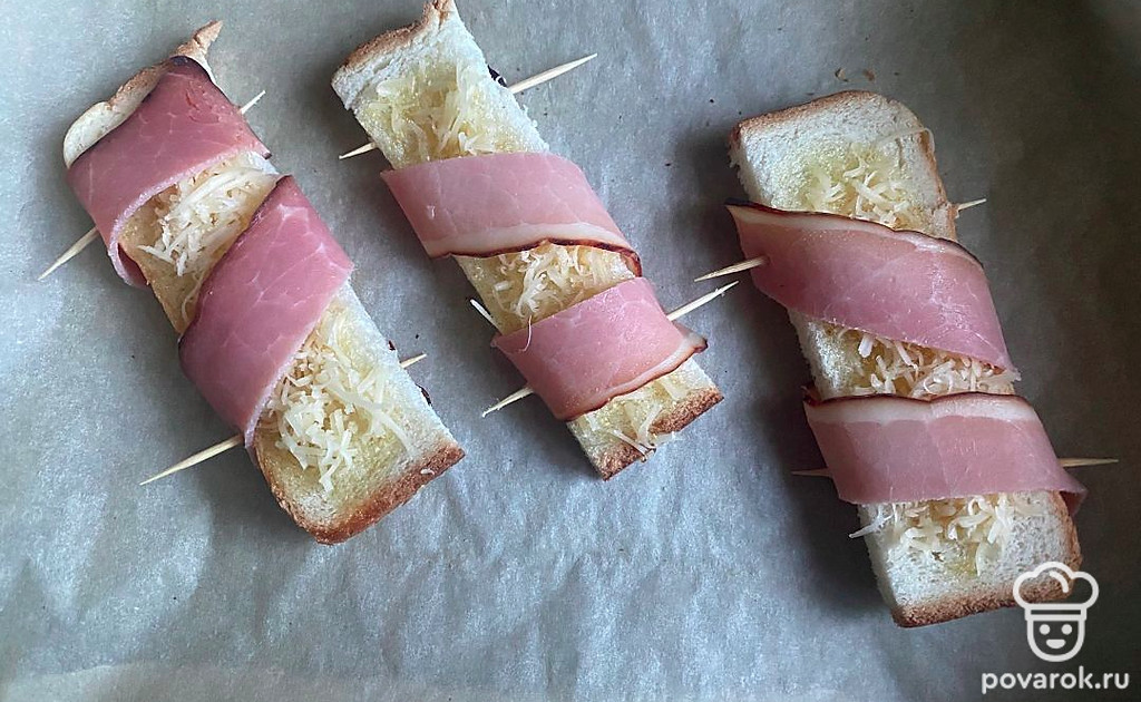 Оберните кусочки тоста окороком. Закрепите зубочистками или шпажками, чтобы при запекании мясные ломтики не развернулись.