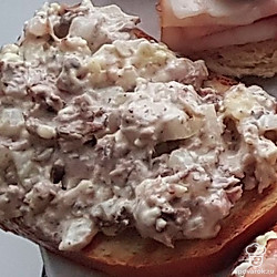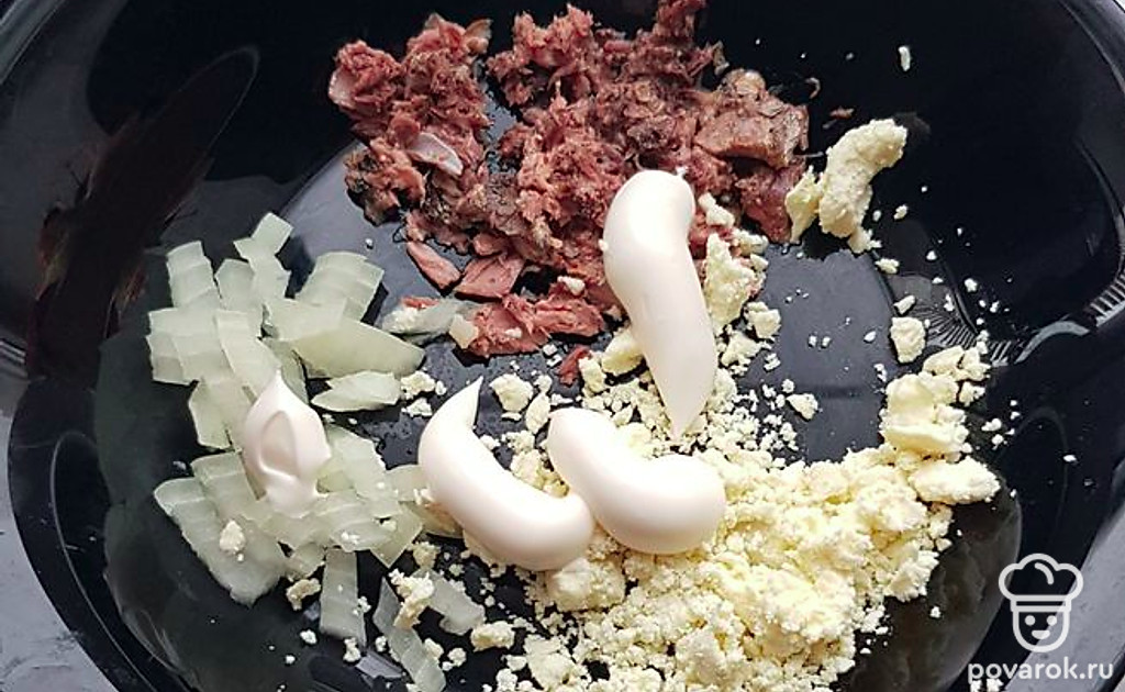 Берем рыбу, нарезаем лук и натираем на терке вареное яйцо, добавляем майонез, все перемешиваем.