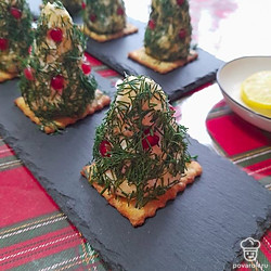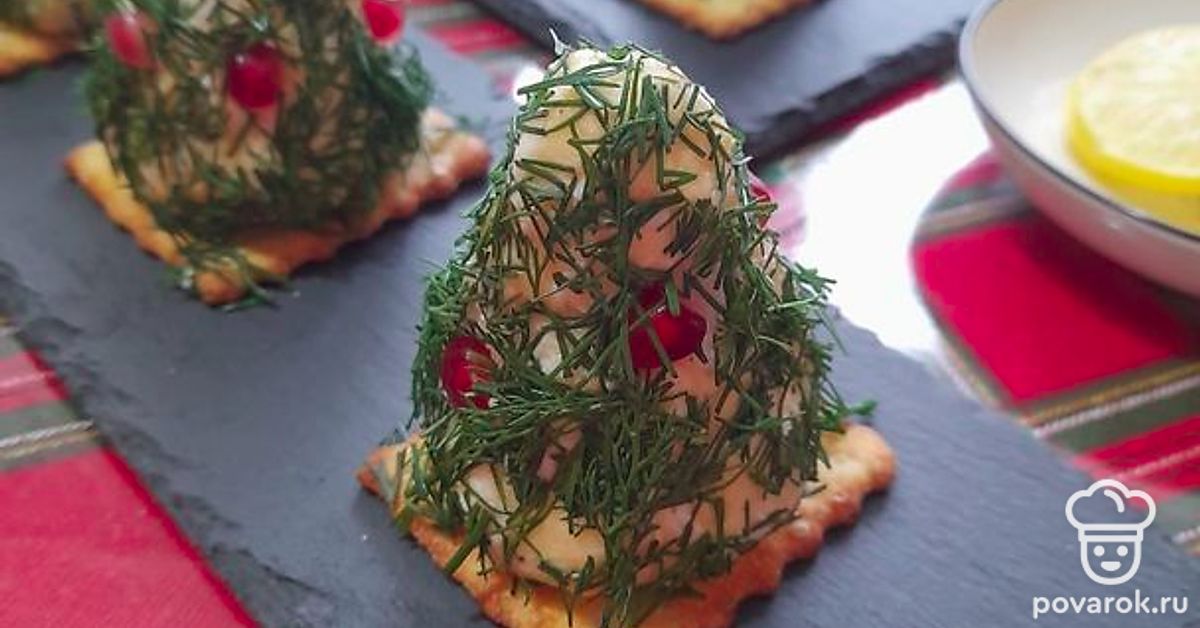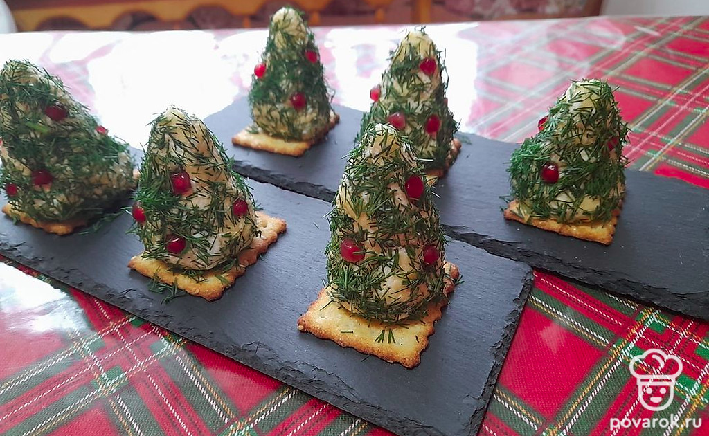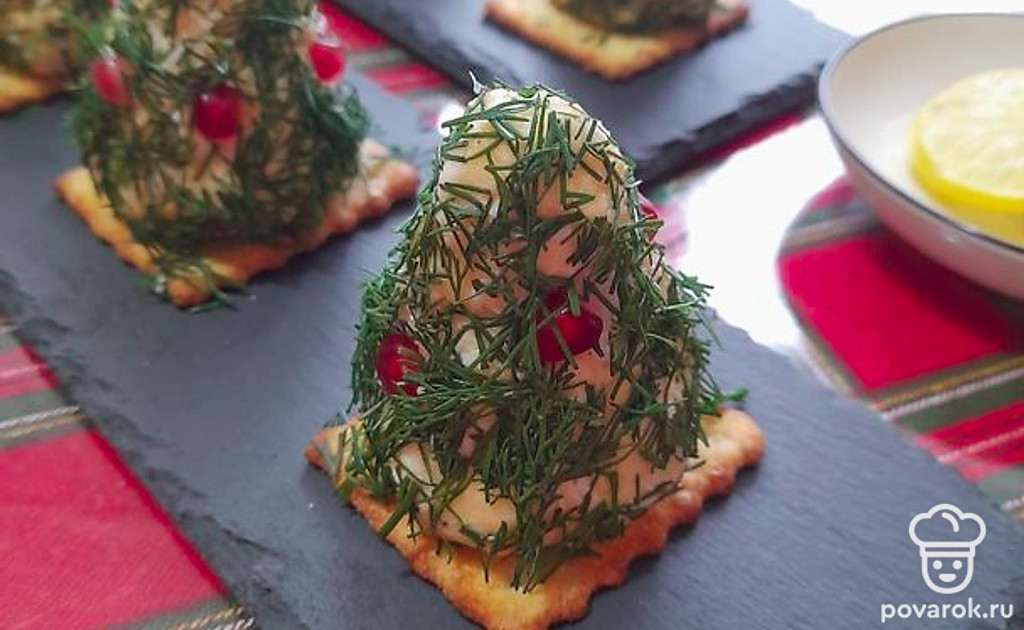Елочки подсаживаем на печенье или крекер, так гостям будет удобней брать закуску руками или лопаткой для подачи.