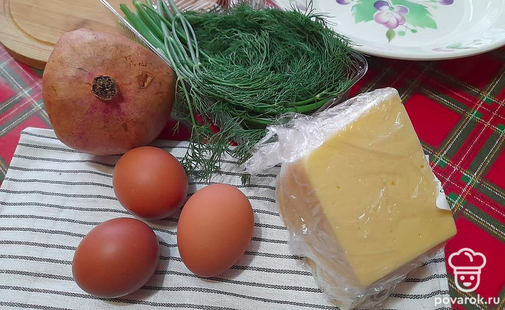 Подготавливаем все ингредиенты. Яйца заранее отвариваем. Гранат понадобится для украшения. Можно заменить другим декором: маслинами, сухофруктами.